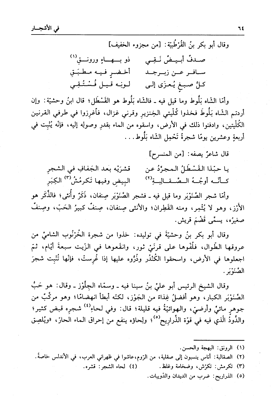 شجر الصنوبر وما قيل فيه : فشجر الصنوبر صنفان ، ذكر وأنثى ، فالذكر هو الأرز ، وهو لا يثمر ، ومنه القطران ، والأنثى صنفان ، صنف كبير الحب ، وصنف صغيرة ، يسمى قريش . وقال أبو بكر بن وحشية في توليده : خذوا من شجرة الخرنوب الشامي من عروقها الطوال ، فلقوها على قرني ثور ، وانقعوها في الزيت سبعة أيام ، ثم جعلوها في الأرض ، وسحقوا الكُنْدُرَ وذروه عليها إذا غرست ، فإنها تنبت شجرة الصنوبر . وقال الشيخ الرئيس أبو علي بن سينا فيه : وسماه الجلوز وقال : هو حب الصنوبر الكبار ، وهو أفضل غذاء من الجوز ، لكنه أبطأ انهضاما ، وهو مركب من جوهرٍ مائي وأرضي ، والهوائية فيه قليلة ، وفي لحاء شجره قبض كثير ، والدود الذي فيه قوة الذَّراريح ، ولحاؤه ينفع من إحراق الماء الحار ، " ويلصق