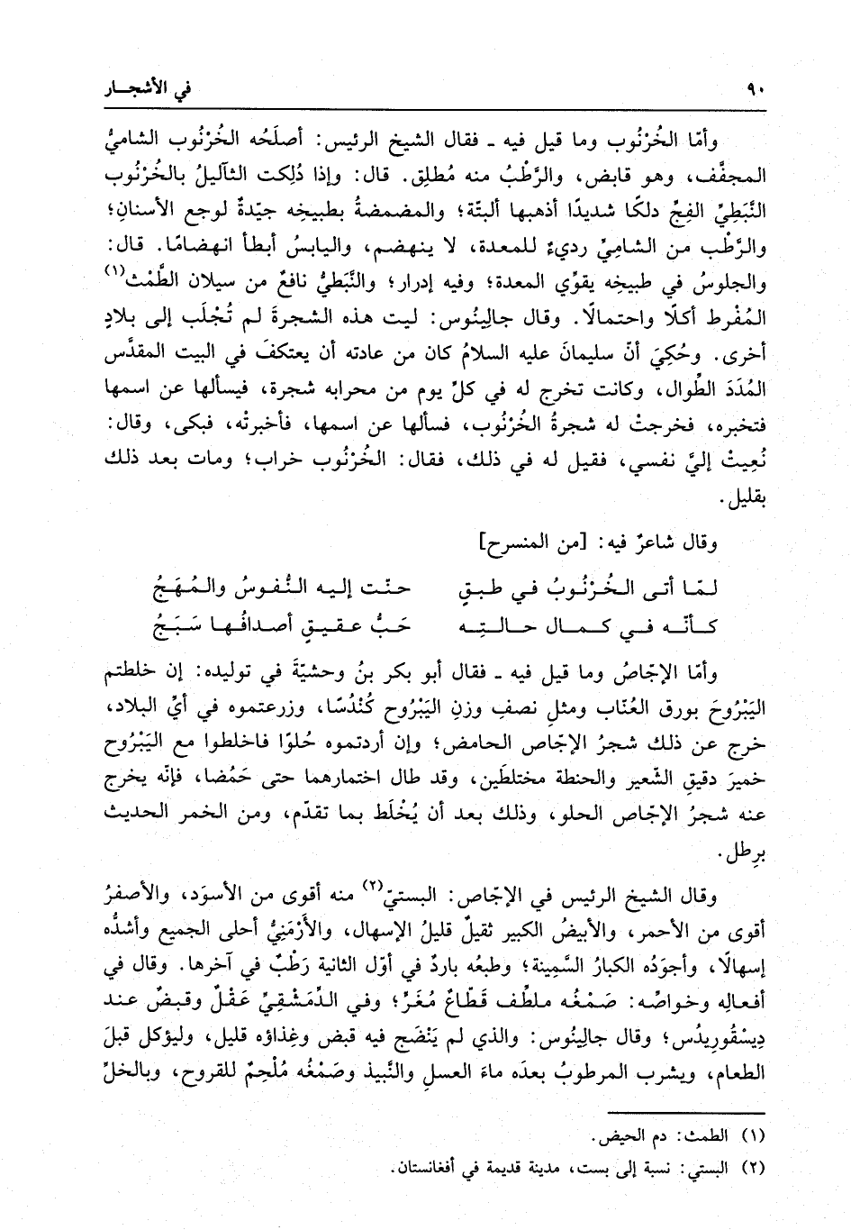 الخُرْنُوب وما قيل فيه - : فقال الشيخ الرئيس : أصلحه الخُرْنُوب الشامي المجفف ، وهو قابض ، والرطب منه مطلق . قال : وإذا دلكت الثآليلُ بالخرنوب النبطي الفج دلكا شديدا أذهبها البتة ، والمضمضةٌ بطبيخه جيدةٌ لوجع الأسنان ، والرطب من الشامي رديء للمعدة ، لا ينهضم ، واليابس أبطأ انهضاما . وقال : والجلوس في طبيخه يقوي المعدة ، وفيه إدرار ، والنبطي نافعُ من سيلان الطمث المفرط أكلاً واحتمالاً . وقال جالينوس : ليت هذه الشجرة لم تجلب إلى بلادٍ أخرى . وحُكي أن سليمان عليه السلام كان من عادته أن يعتكف في البيت المقدس المدد الطوال ، وكانت تخرج له في كل يوم من محرابه شجرة ، فيسألها عن اسمها فتخبره ، فخرجت له شجرة الخرنوب ، فسألها عن اسمها ، فأخبرته ، فبكى ، وقال نُعيتْ إلى نفسي ، فقيل له ذلك ، فقال : الخرنوب خراب ، ومات بعد ذلك بقليل ، وقال الشاعر فيه :