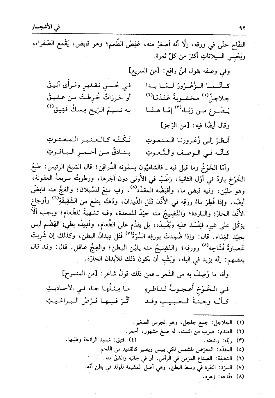 الخوخ وما قيل فيه : فالشاميون يسمونه الدراقن ، قال الشيخ الرئيس : طبع الخوخ بارد في أول ثانية ، رطبُ في الأولى دون آخرها ، ورطوبته سريعة العفونة ، وهو ملين ، وفيه قابض ما ، وأقبضه المقدد ، وفيه منع للسيلان ، والفج منه قابض أيضاً ، وإذا قطر ماء ورقه في الأذن قتل الديدان ، ودهنه ينفع من الشقيقةِ وأوجاعِ الأذن الحارةِ الباردة ، والنضيج منه جيد للمعدة ، وفيه تشهيةٌ للطعام ، ويجب ألا يؤكل على غيره فيفسد عليه ويفسده ، بل يقدم على الطعام ، وقديده بطيء الهضم ليس يجيد الغذاء . وقال : وإذا ضمدتْ بورقه السرةُ قتل ديدان البطن ، وكذلك إن شربت عصارة فقاحه وورقه ، والنضيج منه يلين البطن ، والفج العاقل . قال : وقد قال بعضهم : إنه يزيد في الباه ، ويُشبهِ أن يكون ذلك للأبدان الحارة . وأما ما وصفه به الشعراء - فمن ذلك قول شاعر :