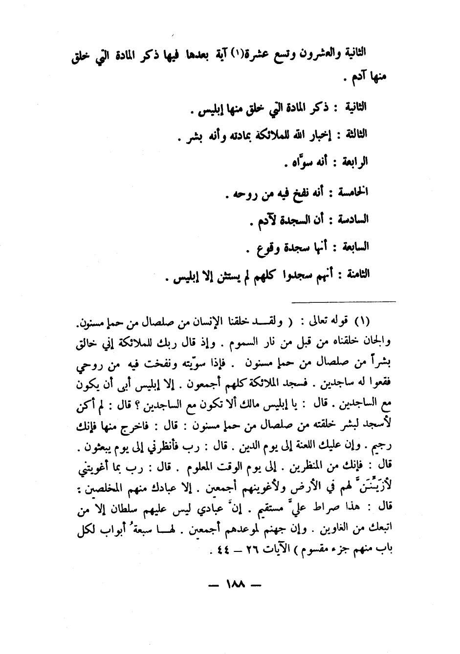 1 قوله تعالى: (ولقد خلقنا الإنسان من صلصال من حمإ مسنون والجان خلقناه من قبل من نار السموم وإذ قال ربك للملائكة إني خالق بشرا من صلصال من حمإ مسنون فإذا سويته ونفخت فيه من روحي فقعوا له ساجدين فسجد الملائكة كلهم أجمعون إلا إبليس أبى أن يكون مع الساجدين قال يا إبليس ما لك ألا تكون مع الساجدين قال لم أكن لأسجد لبشر خلقته من صلصال من حمإ مسنون قال فاخرج منها فإنك رجيم وإن عليك اللعنة إلى يوم الدين قال رب فأنظرني إلى يوم يبعثون قال فإنك من المنظرين إلى يوم الوقت المعلوم قال رب بما أغويتني لأزينن لهم في الأرض ولأغوينهم أجمعين إلا عبادك منهم المخلصين قال هذا صراط علي مستقيم إن عبادي ليس لك عليهم سلطان إلا من اتبعك من الغاوين وإن جهنم لموعدهم أجمعين لها سبعة أبواب لكل باب منهم جزء مقسوم) الآيات 26-44.