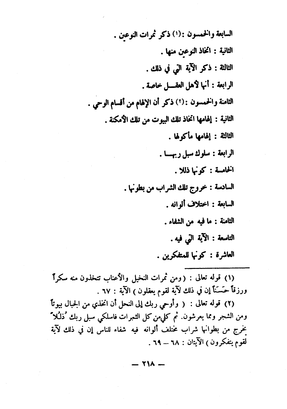 2 قوله تعالى: (وأوحى ربك إلى النحل أن اتخذي من الجبال بيوتا ومن الشجر ومما يعرشون ثم كلي من كل الثمرات فاسلكي سبل ربك ذللا يخرج من بطونها شراب مختلف ألوانه فيه شفاء للناس إن في ذلك لآية لقوم يتفكرون) الآيتان: 68-69.