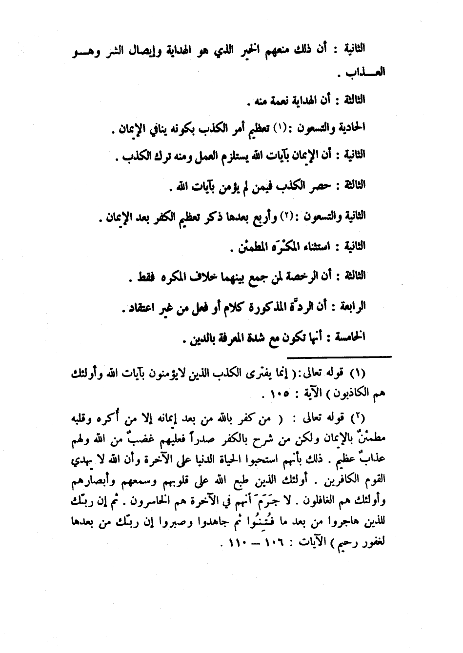 2 قوله تعالى: (من كفر بالله من بعد إيمانه إلا من أكره وقلبه مطمئن بالإيمان ولكن من شرح بالكفر صدرا فعليهم غضب من الله ولهم عذاب عظيم ذلك بأنهم استحبوا الحياة الدنيا على الآخرة وأن الله لا يهدي القوم الكافرين أولئك الذين طبع الله على قلوبهم وسمعهم وأبصارهم وأولئك هم الغافلون لا جرم أنهم في الآخرة هم الخاسرون ثم إن ربك للذين هاجروا من بعد ما فتنوا ثم جاهدوا وصبروا إن ربك من بعدها لغفور رحيم) الآيات: 106-110.