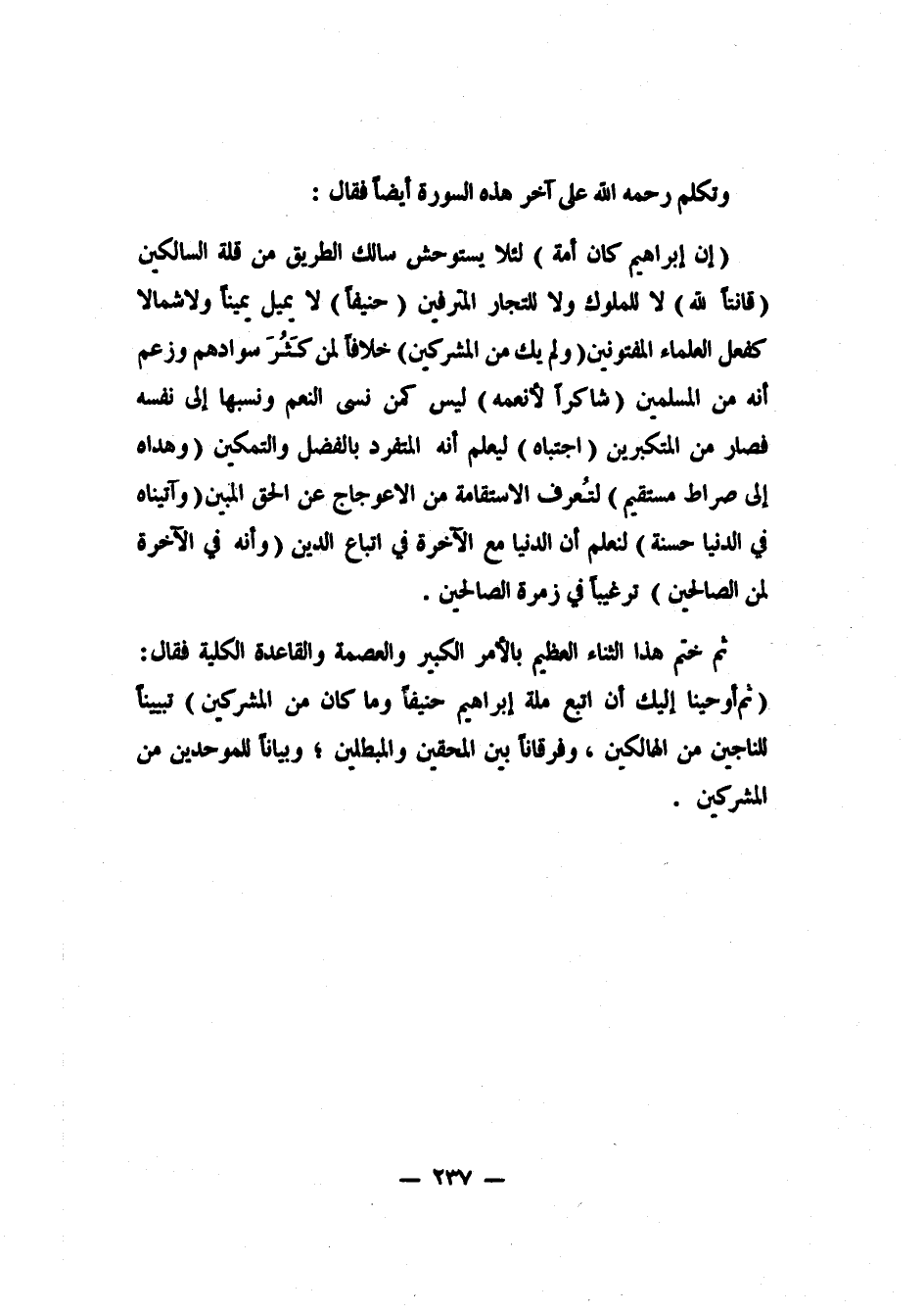 {إِنَّ إِبْرَاهِيمَ كَانَ أُمَّةً} 1 لئلا يستوحش سالك الطريق من قلة السالكين، {قَانِتًا لِلَّهِ} لا للملوك ولا للتجار المترفين، {حَنِيفًا} لا يميل يمينا ولا شمالا كفعل العلماء المفتونين، {ولم يكن من المشركين} 2 خلافا لمن كَثُرَ سوادهم وزعم أنه من المسلمين، {شَاكِرًا لِأَنْعُمِهِ} ليس كمن نسي النعم ونسبها إلى نفسه فصار من المتكبرين. {اجْتَبَاهُ} ليعلم أنه المتفرد بالفضل والتمكين، {وَهَدَاهُ إِلَى صِرَاطٍ مُسْتَقِيمٍ} 3 لتُعرف الاستقامة من الاعوجاج عن الحق المبين {وَآتَيْنَاهُ فِي الدُّنْيَا حَسَنَةً} 4 لنعلم أن الدنيا مع الآخرة في اتباع الدين، {وَإِنَّهُ فِي الْآخِرَةِ لَمِنَ الصَّالِحِينَ} 5 ترغيبا في زمرة الصالحين. ثم ختم هذا الثناء العظيم بالأمر الكبير والعصمة والقاعدة الكلية فقال: {ثُمَّ أَوْحَيْنَا إِلَيْكَ أَنِ اتَّبِعْ مِلَّةَ إِبْرَاهِيمَ حَنِيفاً وَمَا كَانَ مِنَ الْمُشْرِكِينَ} 6 تبيينا للناجين من الهالكين، وفرقانا بين المحقين والمبطلين، وبيانا للموحدين من المشركين.