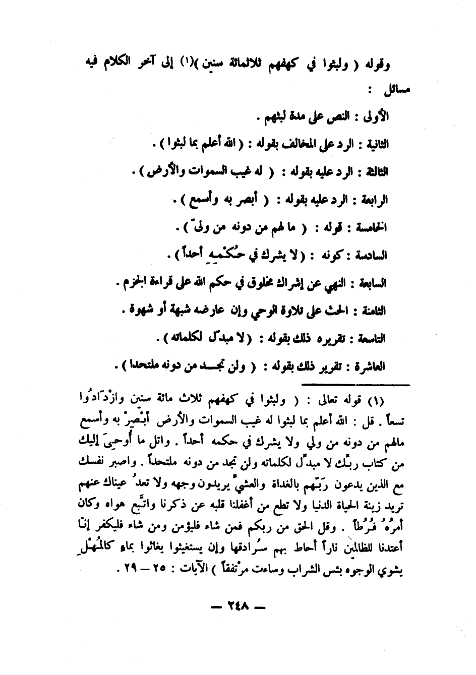 2 قوله تعالى: (ولبثوا في كهفهم ثلاث مائة سنين وازدادوا تسعا قل الله أعلم بما لبثوا له غيب السماوات والأرض أبصر به وأسمع ما لهم من دونه من ولي ولا يشرك في حكمه أحدا واتل ما أوحي إليك من كتاب ربك لا مبدل لكلماته ولن تجد من دونه ملتحدا واصبر نفسك مع الذين يدعون ربهم بالغداة والعشي يريدون وجهه ولا تعد عيناك عنهم تريد زينة الحياة الدنيا ولا تطع من أغفلنا قلبه عن ذكرنا واتبع هواه وكان أمره فرطا وقل الحق من ربكم فمن شاء فليؤمن ومن شاء فليكفر إنا أعتدنا للظالمين نارا أحاط بهم سرادقها وإن يستغيثوا يغاثوا بماء كالمهل يشوي الوجوه بئس الشراب وساءت مرتفقا) الآيات: 25-29.