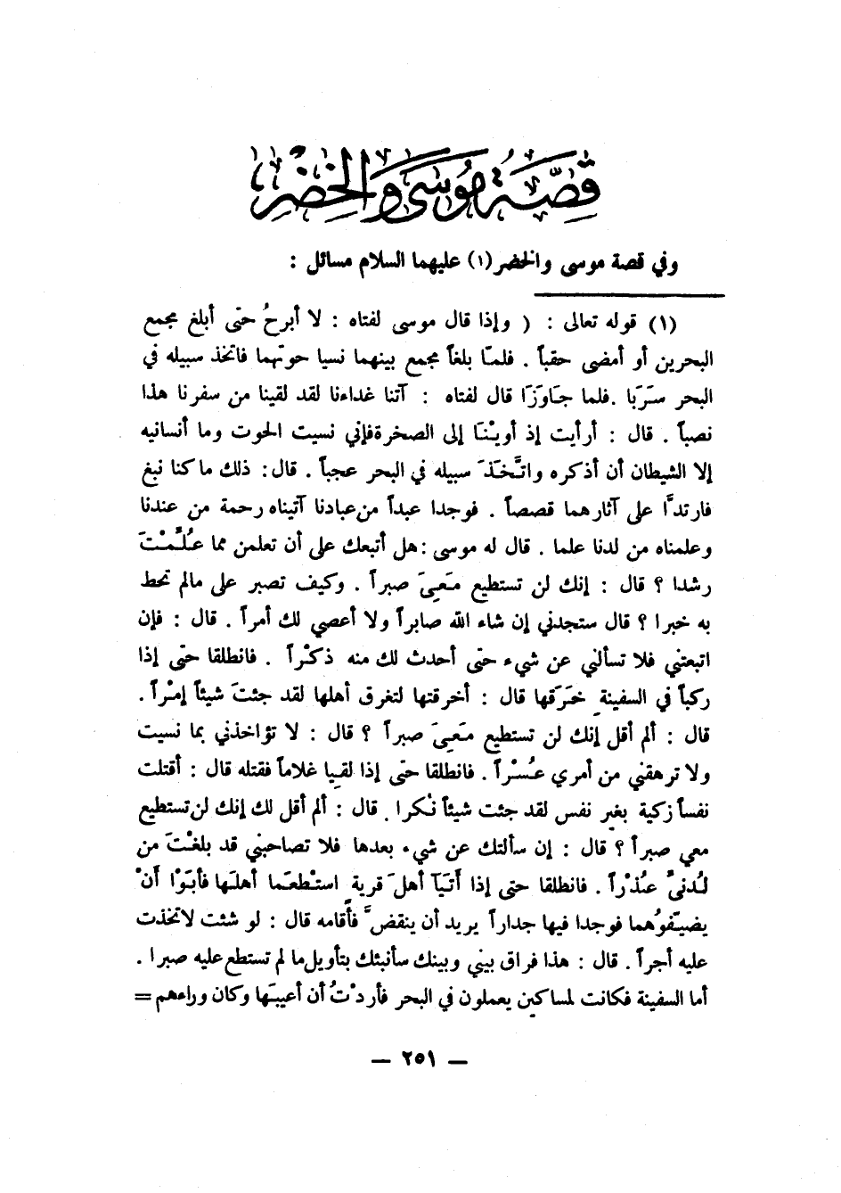1 قوله تعالى: (وإذ قال موسى لفتاه لا أبرح حتى أبلغ مجمع البحرين أو أمضي حقبا فلما بلغا مجمع بينهما نسيا حوتهما فاتخذ سبيله في البحر سربا فلما جاوزا قال لفتاه آتنا غداءنا لقد لقينا من سفرنا هذا نصبا قال أرأيت إذ أوينا إلى الصخرة فإني نسيت الحوت وما أنسانيه إلا الشيطان أن أذكره واتخذ سبيله في البحر عجبا قال ذلك ما كنا نبغ فارتدا على آثارهما قصصا فوجدا عبدا من عبادنا آتيناه رحمة من عندنا وعلمناه من لدنا علما قال له موسى هل أتبعك على أن تعلمن مما علمت رشدا قال إنك لن تستطيع معي صبرا وكيف تصبر على ما لم تحط به خبرا قال ستجدني إن شاء الله صابرا ولا أعصي لك أمرا قال فإن اتبعتني فلا تسألني عن شيء حتى أحدث لك منه ذكرا فانطلقا حتى إذا ركبا في السفينة خرقها قال أخرقتها لتغرق أهلها لقد جئت شيئا إمرا قال ألم أقل إنك لن تستطيع معي صبرا قال لا تؤاخذني بما نسيت ولا ترهقني من أمري عسرا فانطلقا حتى إذا لقيا غلاما فقتله قال أقتلت نفسا زكية بغير نفس لقد جئت شيئا نكرا قال ألم أقل لك إنك لن تستطيع معي صبرا قال إن سألتك عن شيء بعدها فلا تصاحبني قد بلغت من لدني عذرا فانطلقا حتى إذا أتيا أهل قرية استطعما أهلها فأبوا أن يضيفوهما فوجدا فيها جدارا يريد أن ينقض فأقامه قال لو شئت لاتخذت عليه أجرا قال هذا فراق بيني وبينك سأنبئك بتأويل ما لم تستطع عليه صبرا أما السفينة فكانت لمساكين يعملون في البحر فأردت أن أعيبها وكان وراءهم ملك يأخذ كل سفينة غصبا وأما الغلام فكان أبواه مؤمنين فخشينا أن يرهقهما طغيانا وكفرا فأردنا أن يبدلهما ربهما خيرا منه زكاة وأقرب رحما وأما الجدار فكان لغلامين يتيمين في المدينة وكان تحته كنز لهما وكان أبوهما صالحا فأراد ربك أن يبلغا أشدهما ويستخرجا كنزهما رحمة من ربك وما فعلته عن أمري ذلك تأويل ما لم تسطع عليه صبرا) الآيات: 60-82.