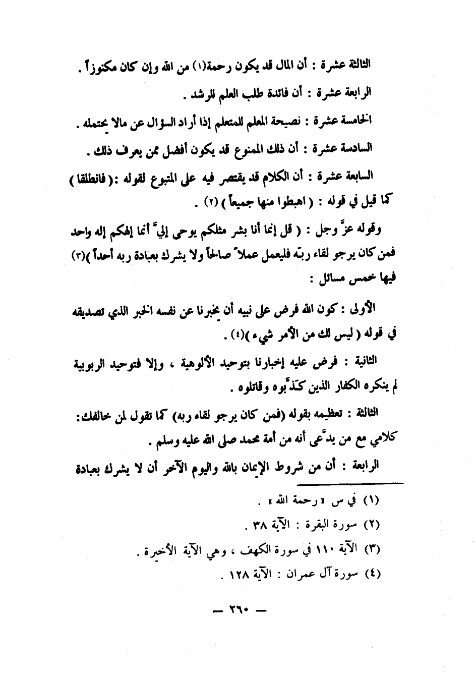 الثالثة: تعظيمه بقوله {فَمَنْ كَانَ يَرْجُوا لِقَاءَ رَبِّهِ} 5، كما تقول لمن خالفك: كلامي مع من يدَّعي أنه من أمة محمد صلى الله عليه وسلم.