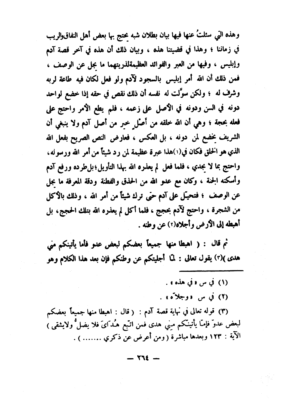 وهذه التي سئلتُ عنها فيها بيان بطلان شبه يحتج بها بعض أهل النفاق والريب في زماننا; وهذا في قضيتنا هذه. وبيان ذلك أن هذه في آخر قصة آدم وإبليس، وفيها من العبر والفوائد العظيمة لذريتهما ما يجل عن الوصف. فمن ذلك أن الله أمر إبليس بالسجود لآدم، ولو فعل لكان فيه طاعة لربه وشرف له; ولكن سوَّلت له نفسه أن ذلك نقص في حقه إذا خضع لواحد دونه في السن ودونه في الأصل على زعمه، فلم يطع الأمر واحتج على فعله بحجة; وهي أن الله خلقه من أَصْلٍ خير من أصل آدم، ولا ينبغي أن الشريف يخضع لمن دونه، بل العكس؛ فعارض النص الصريح بفعل الله الذي هو الخلق، فكان في 1 هذا عبرة عظيمة لمن رد شيئا من أمر الله ورسوله، واحتج بما لا يجدي. فلما فعل لم يعذره الله بهذا التأويل; بل طرده ورفع آدم وأسكنه الجنة. وكان مع عدو الله من الحذق والفطنة ودقة المعرفة ما يجل عن الوصف; فتحيّل على آدم حتى ترك شيئا من أمر الله، وذلك بالأكل من الشجرة، واحتج لآدم بحجج، فلما أكل لم يعذره الله بتلك الحجج، بل أهبطه إلى الأرض وأجلاه 2 عن وطنه.