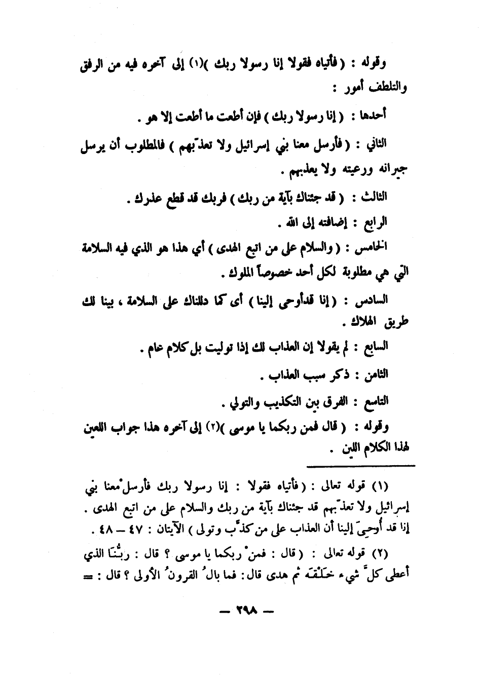 2 قوله تعالى: (فأتياه فقولا إنا رسولا ربك فأرسل معنا بني إسرائيل ولا تعذبهم قد جئناك بآية من ربك والسلام على من اتبع الهدى إنا قد أوحي إلينا أن العذاب على من كذب وتولى) الآيتان: 47-48.