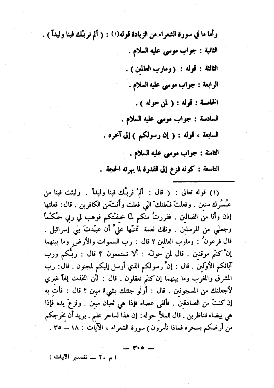 1 قوله تعالى: (قال ألم نربك فينا وليدا ولبثت فينا من عمرك سنين وفعلت فعلتك التي فعلت وأنت من الكافرين قال فعلتها إذا وأنا من الضالين ففررت منكم لما خفتكم فوهب لي ربي حكما وجعلني من المرسلين وتلك نعمة تمنها علي أن عبدت بني إسرائيل قال فرعون وما رب العالمين قال رب السماوات والأرض وما بينهما إن كنتم موقنين قال لمن حوله ألا تستمعون قال ربكم ورب آبائكم الأولين قال إن رسولكم الذي أرسل إليكم لمجنون قال رب المشرق والمغرب وما بينهما إن كنتم تعقلون قال لئن اتخذت إلها غيري لأجعلنك من المسجونين قال أولو جئتك بشيء مبين قال فأت به إن كنت من الصادقين فألقى عصاه فإذا هي ثعبان مبين ونزع يده فإذا هي بيضاء للناظرين قال للملإ حوله إن هذا لساحر عليم يريد أن يخرجكم من أرضكم بسحره فماذا تأمرون سورة الشعراء) الآيات: 18-25.