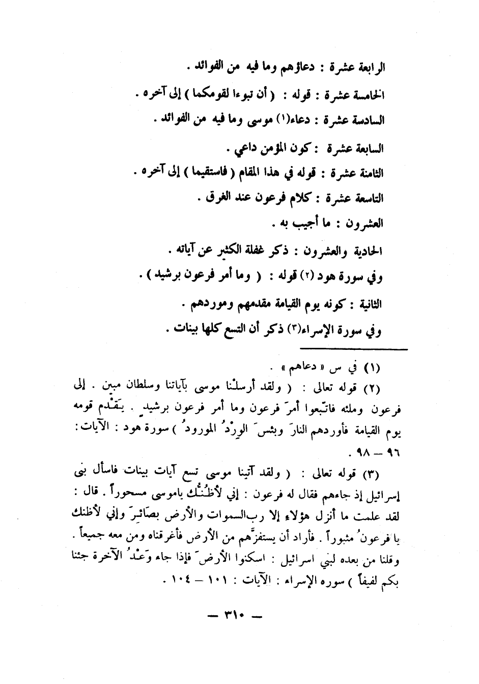 4 قوله تعالى: (ولقد آتينا موسى تسع آيات بينات فاسأل بني إسرائيل إذ جاءهم فقال له فرعون إني لأظنك يا موسى مسحورا قال لقد علمت ما أنزل هؤلاء إلا رب السماوات والأرض بصائر وإني لأظنك يا فرعون مثبورا فأراد أن يستفزهم من الأرض فأغرقناه ومن معه جميعا وقلنا من بعده لبني إسرائيل اسكنوا الأرض فإذا جاء وعد الآخرة جئنا بكم لفيفا) سورة الإسراء: الآيات: 101-104.