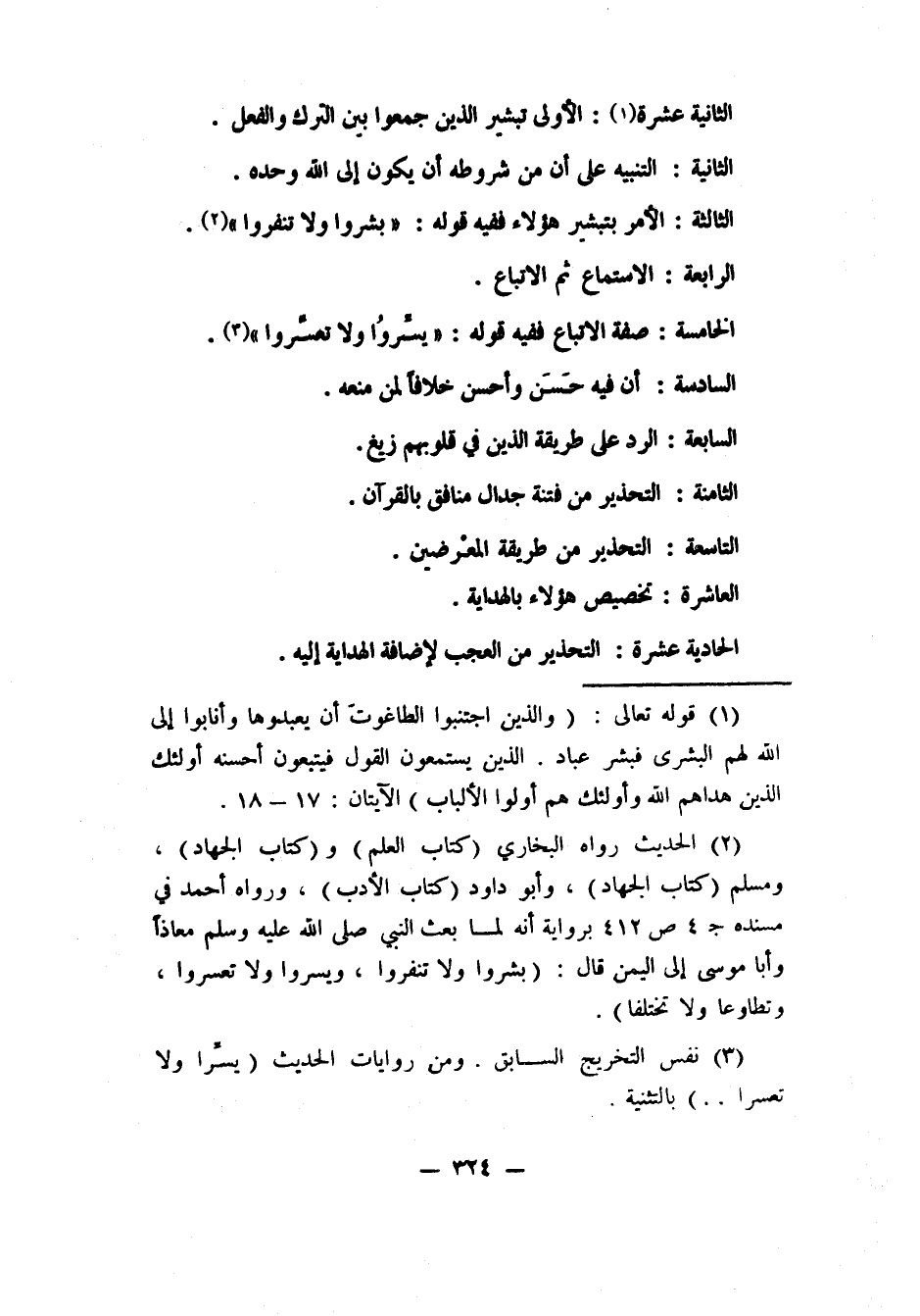 3 الحديث رواه البخاري (كتاب العلم) و (كتاب الجهاد) , ومسلم (كتاب الجهاد) , وأبو داود (كتاب الأدب) , ورواه أحمد في مسنده جـ 4 ص 412 برواية أنه لما بعث النبي صلى الله عليه وسلم معاذا وأبا موسى إلى اليمن قال: بشروا ولا تنفروا, ويسروا ولا تعسروا, وتطاوعا ولا تختلفا.