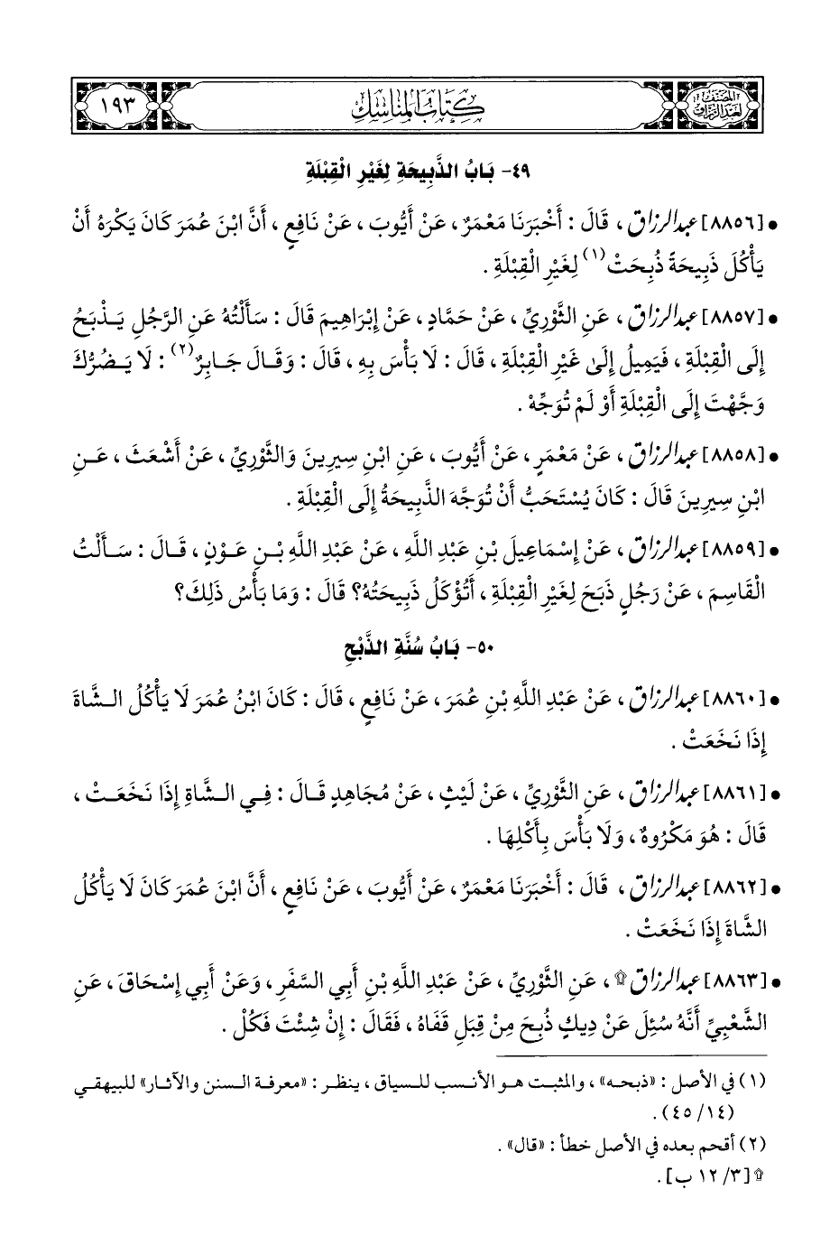 • [٨٨٥٩] عبد الرزاق، عَنْ إِسْمَاعِيلَ بْنِ عَبْدِ اللَّهِ، عَنْ عَبْدِ اللَّهِ بْنِ عَوْنٍ، قَالَ: سَأَلْتُ الْقَاسِمَ، عَنْ رَجُلٍ ذَبَحَ لِغَيْرِ الْقِبْلَةِ، أَتُؤْكَلُ ذَبِيحَتُهُ؟ قَالَ: وَمَا بَأسُ ذَلِكَ؟