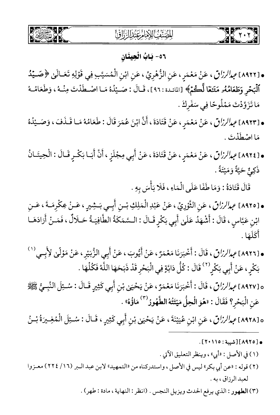 • [٨٩٢٦] عبد الرزاق، قَالَ: أَخْبَرَنَا مَعْمَرٌ، عَنْ أَيُّوبَ، عَنْ أَبِي الزُّبَيْرِ، عَنْ مَوْلًى لِأَبِي (¬١) بَكْرٍ، عَنْ أَبِي بَكْرٍ (¬٢) قَالَ: كُلُّ دَابَّةٍ فِي الْبَحْرِ قَدْ ذَبَحَهَا اللَّهُ فَكُلْهَا.