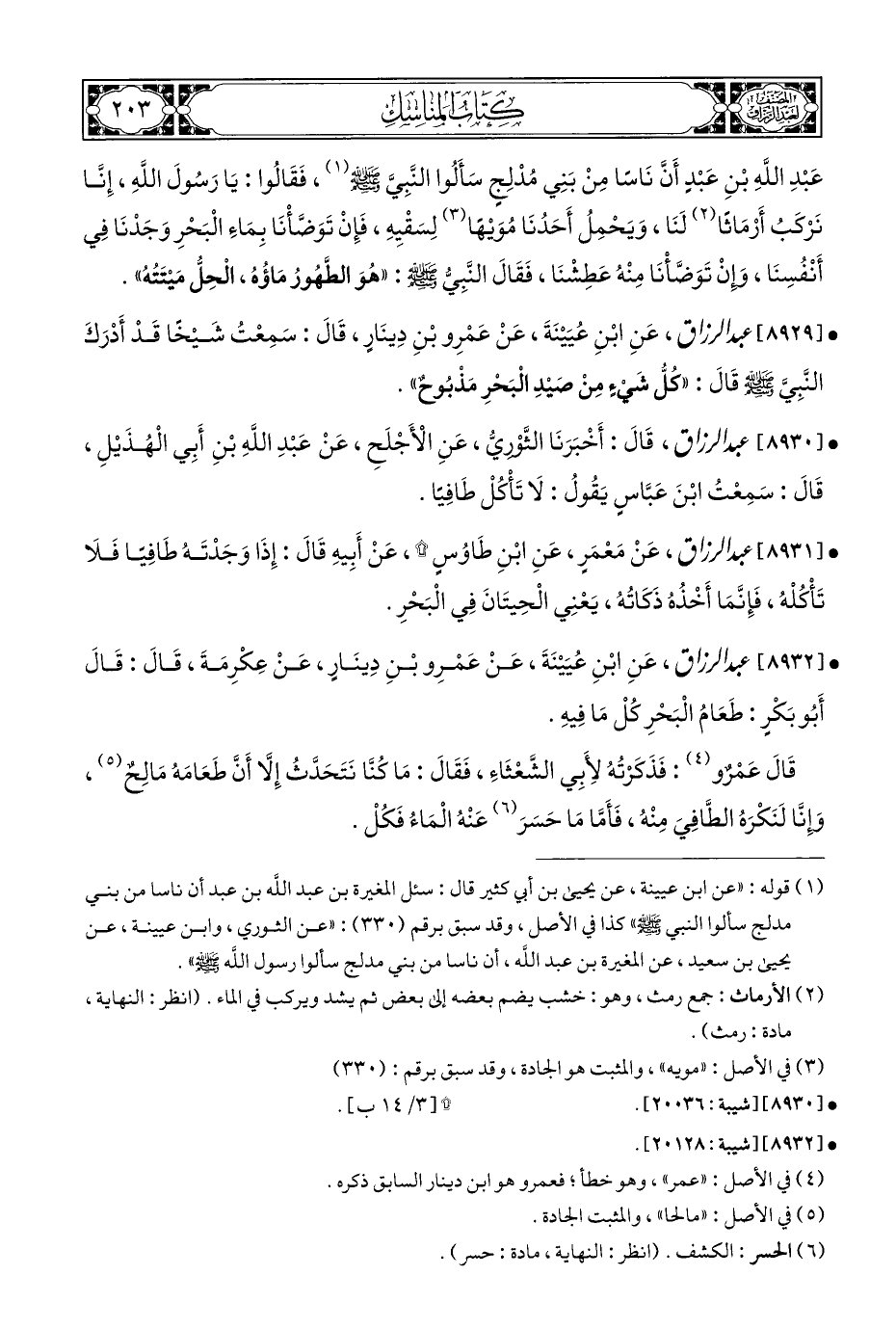 عَبْدِ اللَّهِ بْنِ عَبْدٍ أَنَّ نَاسًا مِنْ بَنِي مُدْلِجٍ سَأَلُوا النَّبِيَّ - صلى الله عليه وسلم - (¬١)، فَقَالُوا: يَا رَسُولَ اللَّهِ، إِنَّا نَرْكَبُ أَرْمَاثًا (¬٢) لَنَا، وَيَحْمِلُ أَحَدُنَا مُوَيْهًا (¬٣) لِسَقْيِهِ، فَإِنْ تَوَضَّأْنَا بِمَاءَ الْبَحْرِ وَجَدْنَا فِي أَنْفُسِنَا، وإِنْ تَوَضَّأْنَا مِنْهُ عَطِشْنَا، فَقَالَ النَّبِيُّ - صلى الله عليه وسلم -: "هُوَ الطَّهُورُ مَاؤُهُ، الْحِلُّ مَيْتَتُهُ".