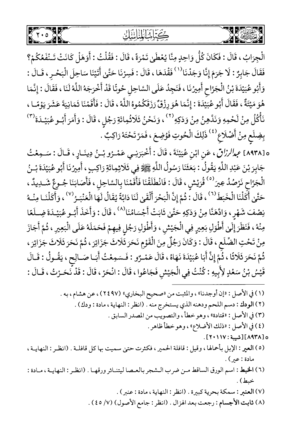 ° [٨٩٣٨] عبد الرزاق، عَنِ ابْنِ عُيَيْنَةَ، قَالَ: أَخْبَرَنِي عَمْرُو بْنُ دِينَارٍ، قَالَ: سَمِعْتُ جَابِرَ بْنَ عَبْدِ اللَّهِ يَقُولُ: بَعَثَنَا رَسُولُ اللَّهِ - صلى الله عليه وسلم - فِي ثَلَاثِمِائَةِ رَاكِبٍ، أَمِيرُنَا أَبُو عُبَيْدَةَ بْنُ الْجَرَّاحِ نَرْصُدُ عِيرَ (¬٥) قُرَيْشٍ، قَالَ: فَانْطَلَقْنَا فَأَقَمْنَا بِالسَّاحِلِ، فَأَصَابَنَا جُوعٌ شَدِيدٌ، حَتَّى أَكَلْنَا الْخَبَطَ (¬٦)، قَالَ: ثُمَّ إِنَّ الْبَحْرَ أَلْقَى لَنَا دَابَّةً يُقَالُ لَهَا الْعَنْبَرُ (¬٧)، وَأَكَلْنَا مِنْهُ نِصْفَ شَهْرٍ، وَادَّهَنَّا مِنْ وَدَكِهِ حَتَّى ثَابَتْ أَجْسَامُنَا (¬٨)، قَالَ: وَأَخَذَ أَبُو عُبَيْدَةَ ضِلَعًا مِنْهُ، فَنَظَرَ إِلَى أَطْوَلِ بَعِيرِ فِي الْجَيْشِ، وَأَطْوَلِ رَجُلٍ فِيهِمْ فَحَمَلَهُ عَلَى الْبَعِيرِ، ثُمَّ أَجَازَ مِنْ تَحْتِ الضِّلَعِ، قَالَ: وَكَانَ رَجُلٌ مِنَ الْقَوْمِ نَحَرَ ثَلَاثَ جَزَائِرَ، ثُمَّ نَحَرَ ثَلَاثَ جَزَائِرَ، ثُمَّ نَحَرَ ثَلَاثًا، ثُمَّ إِنَّ أَبَا عُبَيْدَةَ نَهَاهُ، قَالَ عَمْرٌو: فَسَمِعْتُ أَبَا صَالِحٍ، يَقُولُ: قَالَ قَيْسُ بْنُ سَعْدٍ لِأَبِيهِ: كُنْتُ فِي الْجَيْشِ فَجَاعُوا، قَالَ: انْحَرْ، قَالَ: قَدْ نَحَرْتُ، قَالَ: