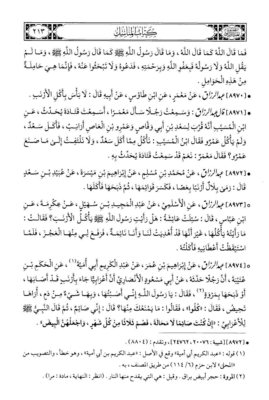 • [٨٩٧٢] عبد الرزاق، عَنْ مُحَمَّدِ بْنِ مُسْلِمٍ، عَنْ إِبْرَاهِيمَ بْنِ مَيْسَرَةَ، عَنْ عُبَيْدِ بْنِ سَعْدٍ قَالَ: رَمَى بِلَالٌ أَرْنَبًا بِعَضًا، فَكَسَرَ قَوَائِمَهَا، ثُمَّ ذَبَحَهَا فَأَكَلَهَا.