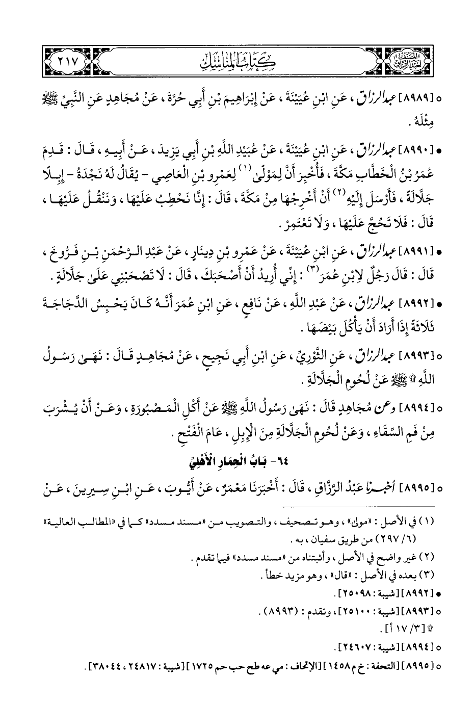 ° [٨٩٩٣] عبد الرزاق، عَنِ الثَّوْرِيِّ، عَنِ ابْنِ أَبِي نَجِيحٍ، عَنْ مُجَاهِدٍ قَالَ: نَهَى رَسُولُ اللَّهِ * - صلى الله عليه وسلم - عَنْ لُحُومِ الْجَلَّالَةِ.