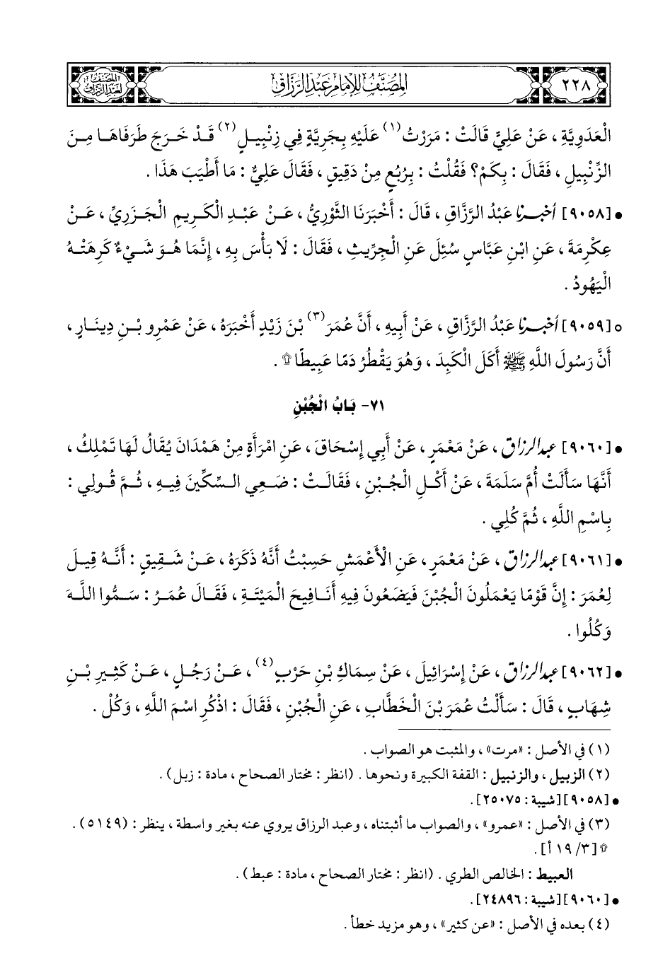 ° [٩٠٥٩] أخبرنا عَبْدُ الرَّزَّاقِ، عَنْ أَبِيهِ، أَنَّ عُمَرَ (¬٣) بْنَ زَيْدٍ أَخْبَرَهُ، عَنْ عَمْرِو بْنِ دِينَارٍ، أَنَّ رَسُولَ اللهِ - صلى الله عليه وسلم - أَكَلَ الْكَبِدَ، وَهُوَ يَقْطُرُ دَمًا عَبِيطًا *.