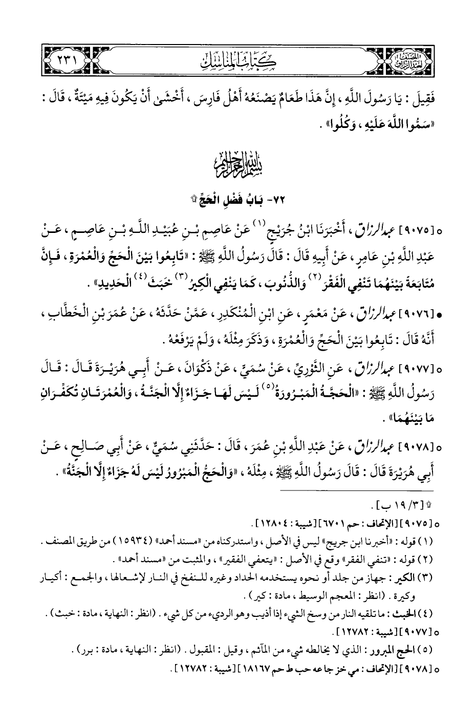 ° [٩٠٧٨] عبد الرزاق، عَنْ عَبْدِ اللَّهِ بْنِ عُمَرَ، قَالَ: حَدَّثَنِي سُمَيٌّ، عَنْ أَبِي صَالِحٍ، عَنْ أَبِي هُرَيْرَةَ قَالَ: قَالَ رَسُولُ اللَّهِ - صلى الله عليه وسلم -، مِثْلَهُ، "وَالْحَجُّ الْمَبْرُورُ لَيْسَ لَهُ جَزَاءٌ إِلَّا الْجَنَّةُ".