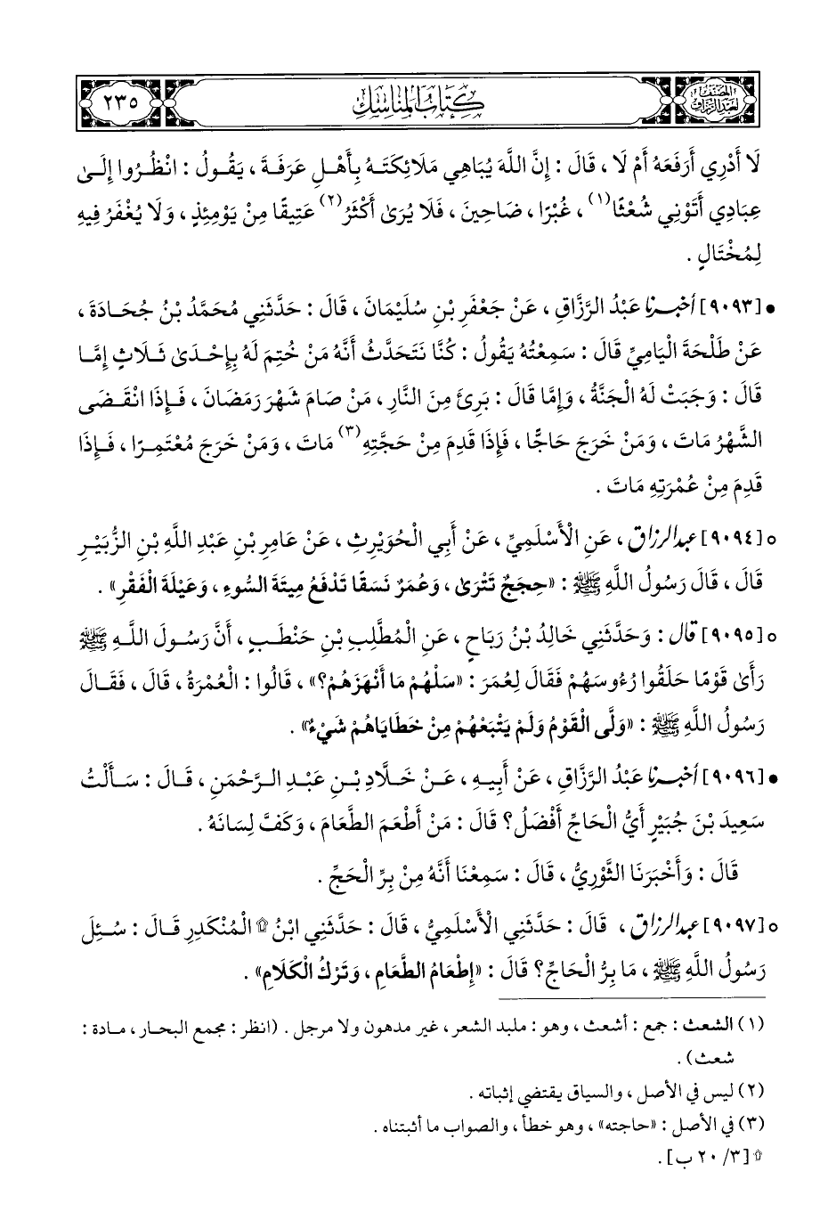 ° [٩٠٩٧] عبد الرزاق، قَالَ: حَدَّثَنِي الْأَسْلَمِيُّ، قَالَ: حَدَّثَنِي ابْنُ * الْمُنْكَدِرِ قَالَ: سُئِلَ رَسُولُ اللَّهِ - صلى الله عليه وسلم -، مَا بِرُّ الْحَاجِّ؟ قَالَ: "إِطْعَامُ الطَّعَامِ، وَتَرْكُ الْكَلَامِ".