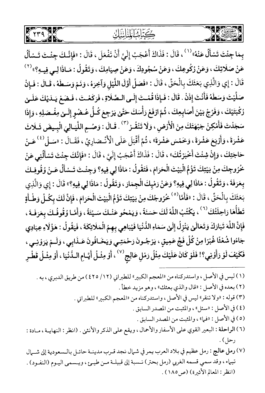 بِمَا جِئْتَ تَسْأَلُ عَنْهُ" (¬١)، قَالَ: فَذَاكَ أَعْجَبُ إِلَيَّ أَنْ تَفْعَلَ، قَالَ: "فَإِنَّكَ جِئْتَ تَسْأَلُ عَنْ صَلَاتِكَ، وَعَنْ رُكُوعِكَ، وَعَنْ سُجُودِكَ، وَعَنْ صِيَامِكَ، وَتَقُولُ: مَاذَا لِي فِيهِ؟ " (¬٢) قَالَ: إِي وَالَّذِي بَعَثَكَ بِالْحَقِّ، قَالَ: "فَصَلِّ أَوَّلَ اللَّيْلِ وَآخِرَهُ، وَنَمْ وَسَطَهُ، قَالَ: فَإِنْ صَلَّيْتَ وَسَطَهُ فَأَنْتَ إِذَنْ. قَالَ: فَإِذَا قُمْتَ إِلَى الصَّلَاةِ، فَرَكَعْتَ، فَضَعْ يَدَيْكَ عَلَى رُكبَتَيْكَ، وَفَرِّجْ بَيْنَ أَصَابِعِكَ، ثُمَّ ارْفَعْ رَأْسَكَ حَتَّى يَرْجِعَ كُلُّ عُضْوٍ إِلَى مِفْصَلِهِ، وَإذَا سَجَدْتَ فَأَمْكِنْ جَبْهَتَكَ مِنَ الْأَرْضِ، وَلَا تَنْقُرْ (¬٣). قَالَ: وَصُمِ اللَّيَالِيَ الْبِيضَ ثَلَاثَ عَشْرَةَ، وَأَرْبعَ عَشْرَةَ، وَخَمْسَ عَشْرَةَ"، ثُمَّ أَقْبَلَ عَلَى الْأَنْصارِيِّ، فَقَالَ: "سَلْ (¬٤) عَنْ حَاجَتِكَ، وَإِنْ شِئْتَ أَخْبَرْتُكَ"، قَالَ: فَذَاكَ أَعْجَبُ إِلَيَّ، قَالَ: "فَإِنَّكَ جِئْتَ تَسْأَلُنِي عَنْ خُرُوجِكَ مِنْ بَيْتِكَ تَؤُمُّ الْبَيْتَ الْحَرَامَ، فَتَقُولُ: مَاذَا لِي فِيهِ؟ وَجِئْتَ تَسْأَلُ عَنْ وُقُوفِكَ بِعَرَفَةَ، وَتَقُولُ: مَاذَا لِي فِيهِ؟ وَعَنْ رَمْيِكَ الْجِمَارَ، وَتَقُولُ: مَاذَا لِي فِيهِ؟ " قَالَ: إِي وَالَّذِي بَعَثَكَ بِالْحَقِّ، قَالَ: "فَأَمَّا (¬٥) خُرُوجُكَ مِنْ بَيْتِكَ تَؤُمُّ الْبَيْتَ الْحَرَامَ، فَإِنَّ لَكَ بِكُلِّ وَطْأَةٍ تَطَأُهَا رَاحِلَتُكَ (¬٦)، يَكْتُبُ اللهُ لَكَ حَسَنَةً، وَيَمْحُو عَنْكَ سَيِّئَةً، وَأَمَّا وُقُوفُكَ بِعَرَفَةَ، فَإِنَّ اللهَ تَبَارَكَ وَتَعَالَى يَنْزِلُ إِلَى سَمَاءِ الدُّنْيَا فَيُبَاهِي بِهِمُ الْمَلَائِكَةَ، فَيَقُولُ: هَؤُلَاءِ عِبَادِي جَاءُوا شُعْثًا غُبْرًا مِنْ كُلِّ فَجِّ عَمِيقٍ، يَرْجُونَ رَحْمَتِي وَيَخَافُونَ عَذَابِي، وَلَمْ يَرَوْنِي، فَكَيْفَ لَوْ رَأَوْنِي؟! فَلَوْ كَانَ عَلَيْكَ مِثْلُ رَمْلِ عَالِجٍ (¬٧)، أَوْ مِثْلُ أَيَّامِ الدُّنْيَا، أَوْ مِثْلُ قَطْرِ