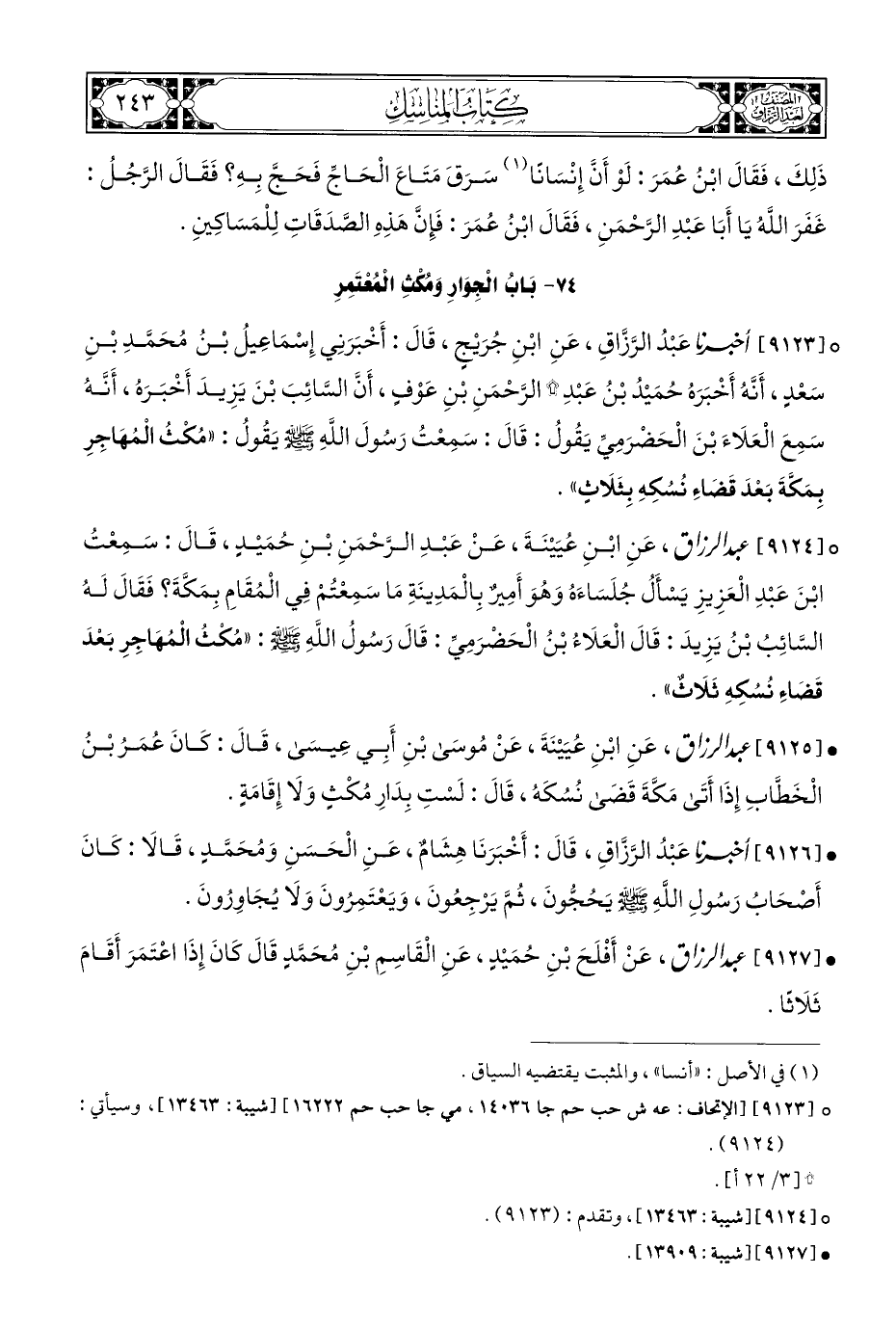 ° [٩١٢٤] عبد الرزاق، عَنِ ابْنِ عُيَيْنَةَ، عَنْ عَبْدِ الرَّحْمَنِ بْنِ حُمَيْدٍ، قَالَ: سَمِعْتُ ابْنَ عَبْدِ الْعَزِيزِ يَسْأَلُ جُلَسَاءَهُ وَهُوَ أَمِيرٌ بِالْمَدِينَةِ مَا سَمِعْتُمْ فِي الْمُقَامِ بِمَكَّةَ؟ فَقَالَ لَهُ السَّائِبُ بْنُ يَزِيدَ: قَالَ الْعَلَاءُ بْنُ الْحَضرَمِيِّ: قَالَ رَسُولُ اللَّهِ - صلى الله عليه وسلم -: "مُكْثُ الْمُهَاجِرِ بَعْدَ قَضَاءِ نُسُكِهِ ثَلَاثٌ".