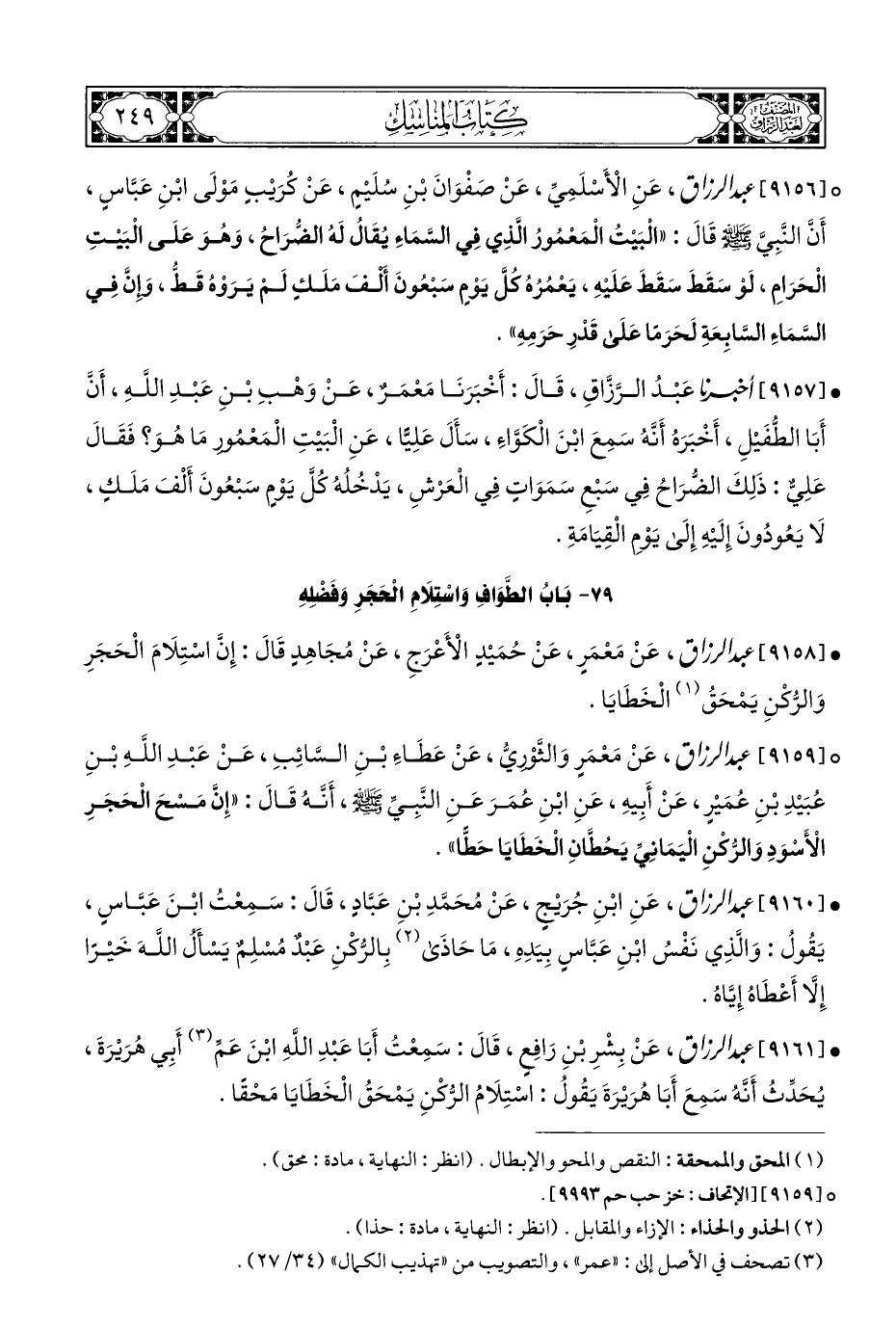 ° [٩١٥٩] عبد الرزاق، عَنْ مَعْمَرٍ وَالثَّوْرِيُّ، عَنْ عَطَاءِ بْنِ السَّائِبِ، عَنْ عَبْدِ اللَّهِ بْنِ عُبَيدِ بْنِ عُمَيْرٍ، عَنْ أَبِيهِ، عَنِ ابْنِ عُمَرَ عَنِ النَّبِيِّ - صلى الله عليه وسلم -، أَنَّهُ قَالَ: "إِنَّ مَسْحَ الْحَجَرِ الْأَسْوَدِ وَالرُّكْنِ الْيَمَانِيِّ يَحُطَّانِ الْخَطَايا حَطًّا".