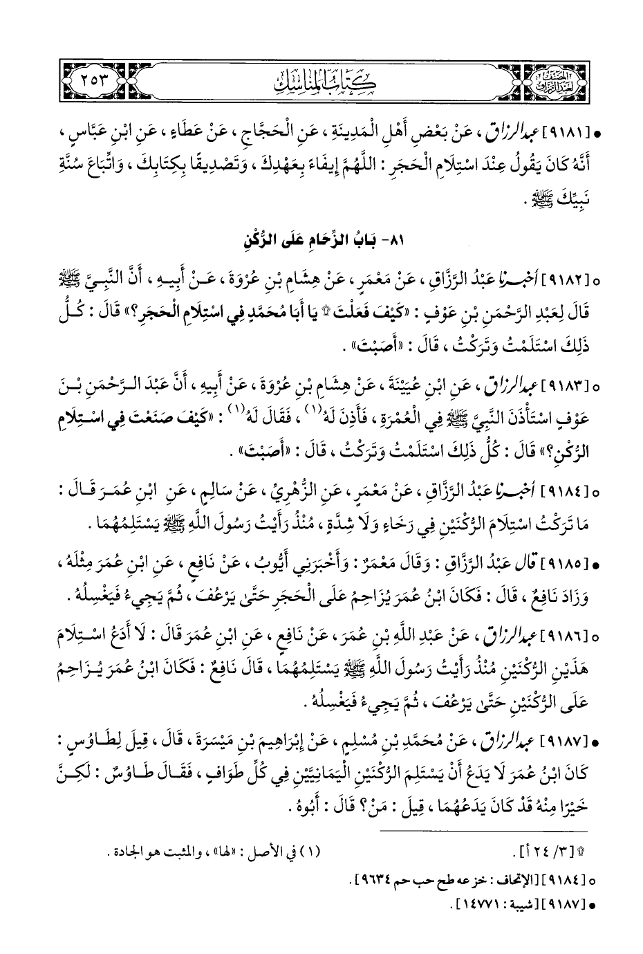 ° [٩١٨٤] أخبرنا عَبْدُ الرَّزَّاقِ، عَنْ مَعْمَرٍ، عَنِ الزُّهْرِيِّ، عَنْ سَالِمٍ، عَنِ ابْنِ عُمَرَ قَالَ: مَا تَرَكْتُ اسْتِلَامَ الرُّكْنَيْنِ فِي رَخَاءٍ وَلَا شدَّةٍ، مُنْذُ رَأَيْتُ رَسُولَ اللَّهِ - صلى الله عليه وسلم - يَسْتَلِمُهُمَا.