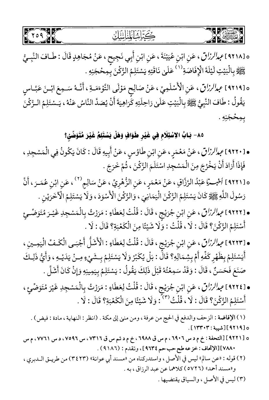 ° [٩٢١٩] عبد الرزاق، عَنِ الْأَسْلَمِيِّ، عَنْ صالِحٍ مَوْلَى التَّوْءَمَةِ، أَنَّهُ سَمِعَ ابْنَ عَبَّاسٍ يَقُولُ: طَافَ النَّبِيُّ - صلى الله عليه وسلم - بِالْبَيْتِ عَلَى رَاحِلَتِهِ كَرَاهِيَةَ أَنْ يُصَدَّ النَّاسُ عَنْهُ، يَسْتَلِمُ الرُّكْنَ بِمِحْجَنِهِ.