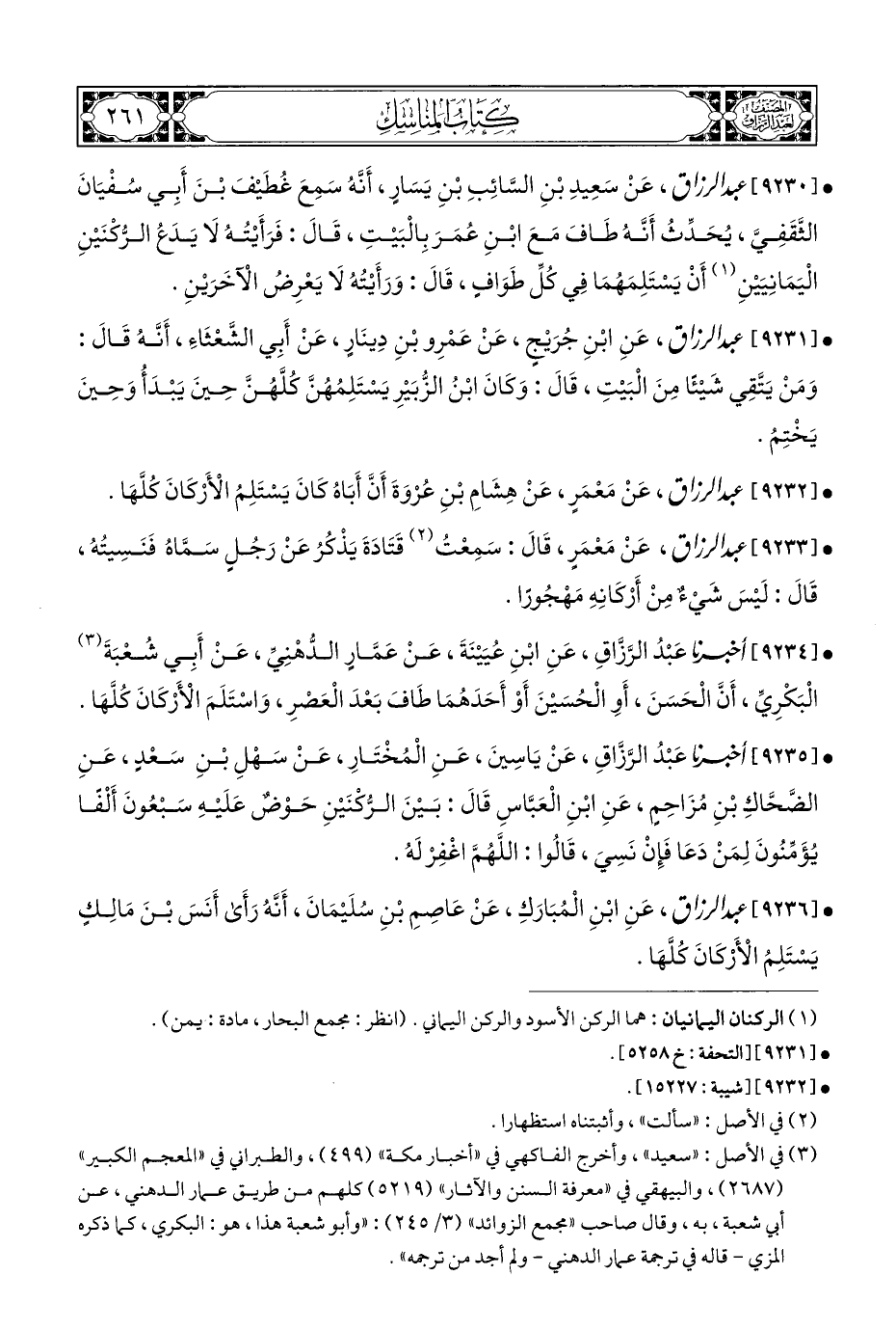 • [٩٢٣٤] أخبرنا عَبْدُ الرَّزَّاقِ، عَنِ ابْنِ عُيَيْنَةَ، عَنْ عَمَّارٍ الدُّهْنِيِّ، عَنْ أَبِي شُعْبَةَ (¬٣) الْبَكْرِيِّ، أَنَّ الْحَسَنَ، أَوِ الْحُسَيْنَ أَوْ أَحَدَهُمَا طَافَ بَعْدَ الْعَصْرِ، وَاسْتَلَمَ الْأَرْكَانَ كُلَّهَا.
