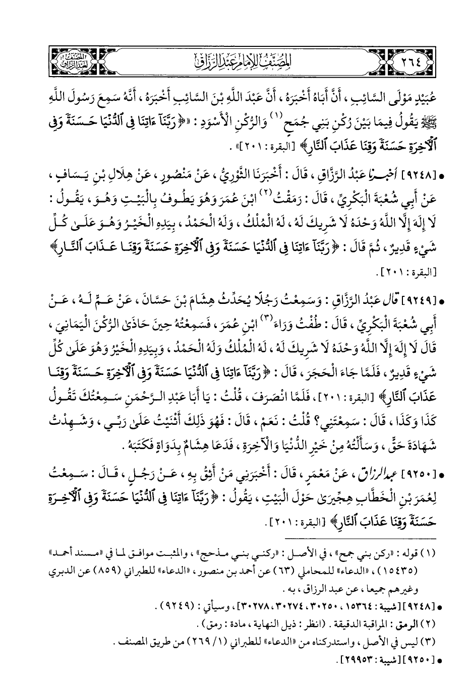 • [٩٢٤٨] أخبرنا عَبْدُ الرَّزَّاقِ، قَالَ: أَخْبَرَنَا الثَّوْرِيُّ، عَنْ مَنْصور، عَنْ هِلَالِ بْنِ يَسَافٍ، عَنْ أَبِي شُعْبَةَ الْبَكْرِيِّ، قَالَ: رَمَقْتُ (¬٢) ابْنَ عُمَرَ وَهُوَ يَطُوفُ بِالْبَيْتِ وَهُوَ، يَقُولُ: لَا إِلَهَ إِلَّا اللَّهُ وَحْدَهُ لَا شَرِيكَ لَهُ، لَهُ الْمُلْكُ، وَلَهُ الْحَمْدُ، بِيَدِهِ الْخَيْرُ وَهُوَ عَلَى كُلِّ شَيءٍ قَدِيرٌ، ثُمَّ قَالَ: {رَبَّنَا آتِنَا فِي الدُّنْيَا حَسَنَةً وَفِي الْآخِرَةِ حَسَنَةً وَقِنَا عَذَابَ النَّارِ} [البقرة: ٢٠١].
