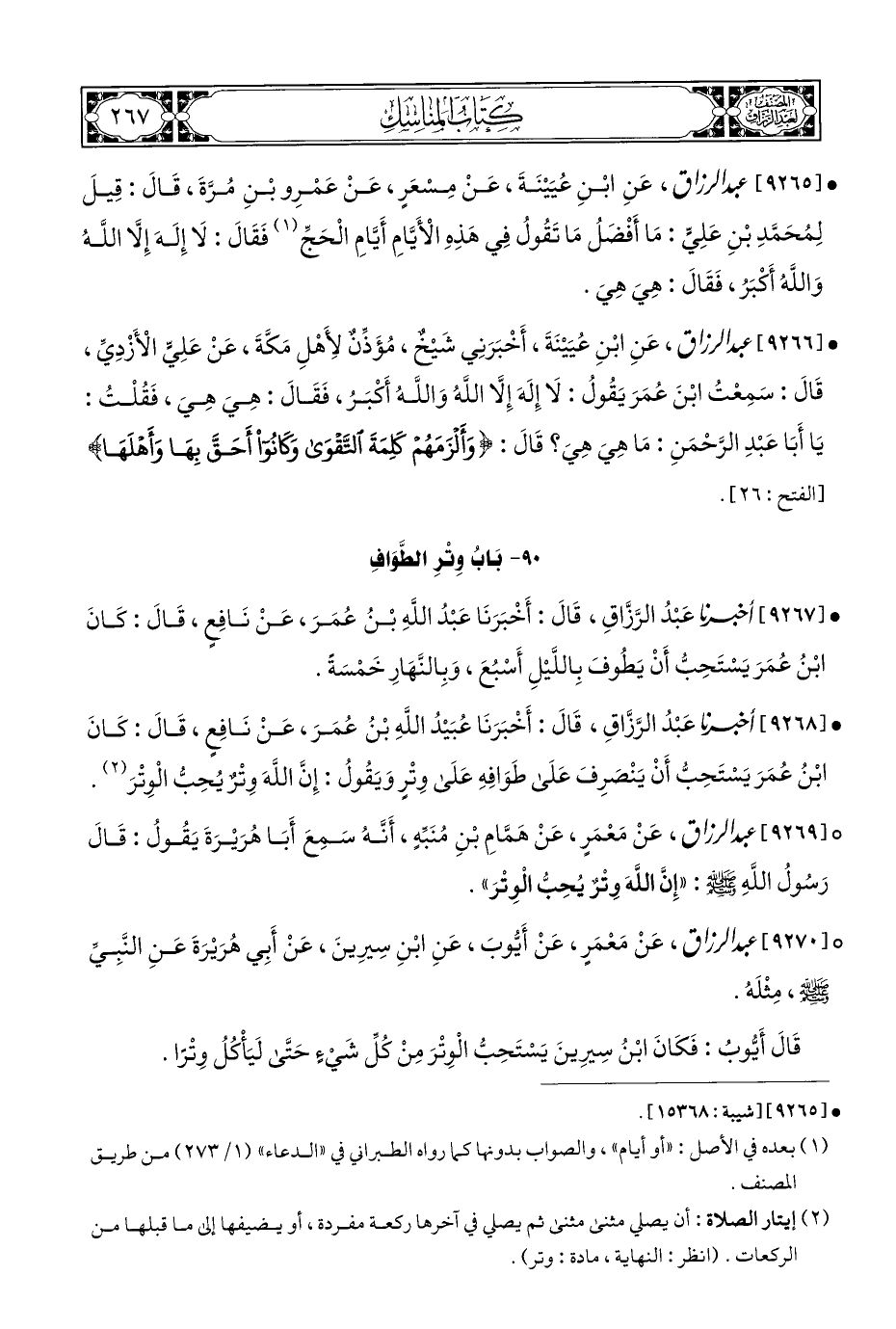 • [٩٢٦٨] أخبرنا عَبْدُ الرَّزَّاقِ، قَالَ: أَخْبَرَنَا عُبَيْدُ اللَّهِ بْنُ عُمَرَ، عَنْ نَافِعٍ، قَالَ: كَانَ ابْنُ عُمَرَ يَسْتَحِبُّ أَنْ يَنْصرِفَ عَلَى طَوَافِهِ عَلَى وِتْرٍ وَيَقُولُ: إِنَّ اللَّهَ وِتْرٌ يُحِبُّ الْوِتْرَ (¬٢).