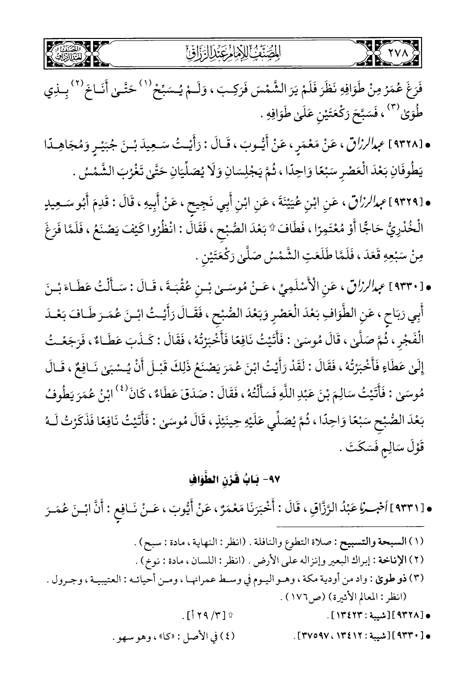 • [٩٣٣١] أخبرنا عَبْدُ الرَّزَّاقِ، قَالَ: أَخْبَرَنَا مَعْمَرٌ، عَنْ أَيُّوبَ، عَنْ نَافِعٍ: أَنَّ ابْنَ عُمَرَ