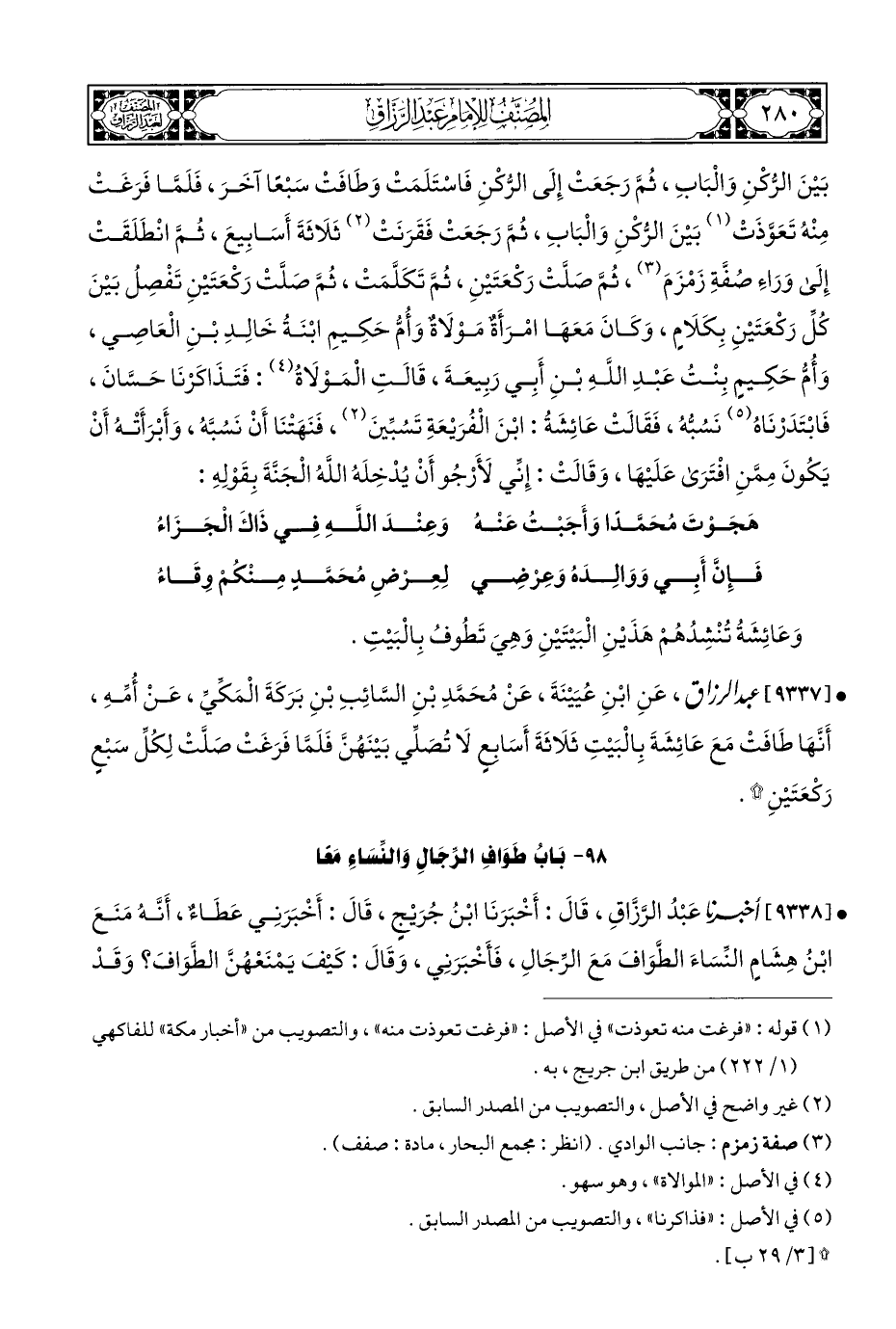 • [٩٣٣٨] أخبرنا عَبْدُ الرَّزَّاقِ، قَالَ: أَخْبَرَنَا ابْنُ جُرَيْجٍ، قَالَ: أَخْبَرَنِي عَطَاءٌ، أَنَّهُ مَنَعَ ابْنُ هِشَامٍ النِّسَاءَ الطَّوَافَ مَعَ الرِّجَالِ، فَأَخْبَرَنِي، وَقَالَ: كَيْفَ يَمْنَعْهُنَّ الطَّوَافَ؟ وَقَدْ