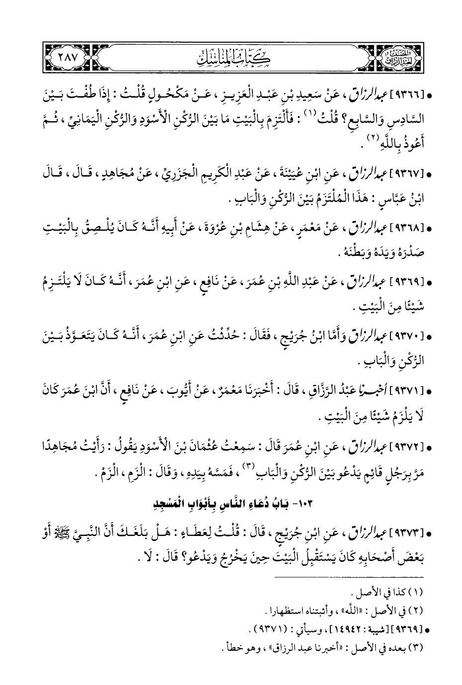 • [٩٣٧٢] عبد الرزاق، عَنِ ابْنِ عُمَرَ قَالَ: سَمِعْتُ عُثْمَانَ بْنَ الْأَسْوَدِ يَقُولُ: رَأَيْتُ مُجَاهِدًا مَرَّ بِرَجُلٍ قَائِمٍ يَدْعُو بَيْنَ الرُّكْنِ وَالْبَابِ (¬٣)، فَمَسَّهُ بِيَدِهِ، وَقَالَ: الْزَمِ، الْزَمْ.
