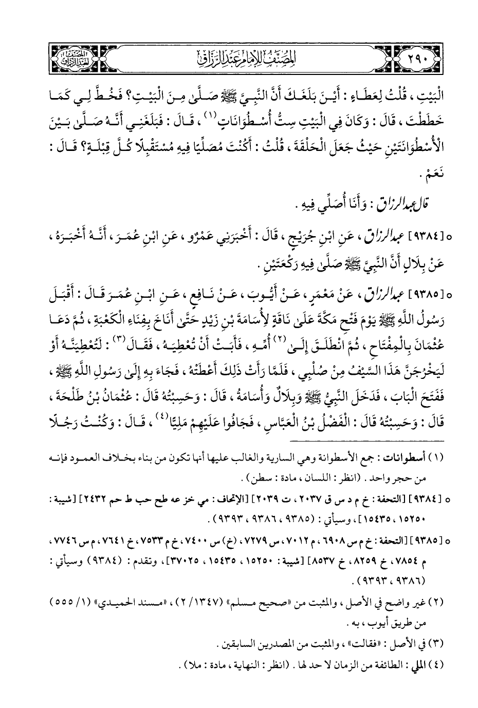 ° [٩٣٨٥] عبد الرزاق، عَنْ مَعْمَرٍ، عَنْ أَيُّوبَ، عَنْ نَافِعٍ، عَنِ ابْنِ عُمَرَ قَالَ: أَقْبَلَ رَسُولُ اللَّهِ - صلى الله عليه وسلم - يَوْمَ فَتْحِ مَكَّةَ عَلَى نَاقَةٍ لِأُسَامَةَ بْنِ زَيْدٍ حَتَّى أَنَاخَ بِفِنَاءِ الْكَعْبَةِ، ثُمَّ دَعَا عُثْمَانَ بِالْمِفْتَاحِ، ثُمَّ انْطَلَقَ إِلَى (¬٢) أُمِّهِ، فَأَبَتْ أَنْ تُعْطِيَهُ، فَقَالَ (¬٣): لَتُعْطِيَنَّهُ أَوْ لَيَخْرُجَنَّ هَذَا السَّيْفُ مِنْ صُلْبِي، فَلَمَّا رَأَتْ ذَلِكَ أَعْطَتْهُ، فَجَاءَ بِهِ إِلَى رَسُولِ اللَّهِ - صلى الله عليه وسلم -، فَفَتَحَ الْبَابَ، فَدَخَلَ النَّبِيُّ - صلى الله عليه وسلم - وَبِلَال وَأُسَامَةُ، قَالَ: وَحَسِبْتُهُ قَالَ: عُثْمَانُ بْنُ طَلْحَةَ، قَالَ: وَحَسِبْتُهُ قَالَ: الْفَضْلُ بْنُ الْعَبُّاسِ، فَجَافُوا عَلَيْهِمْ مَلِيًّا (¬٤)، قَالَ: وَكُنْتُ رَجُلًا