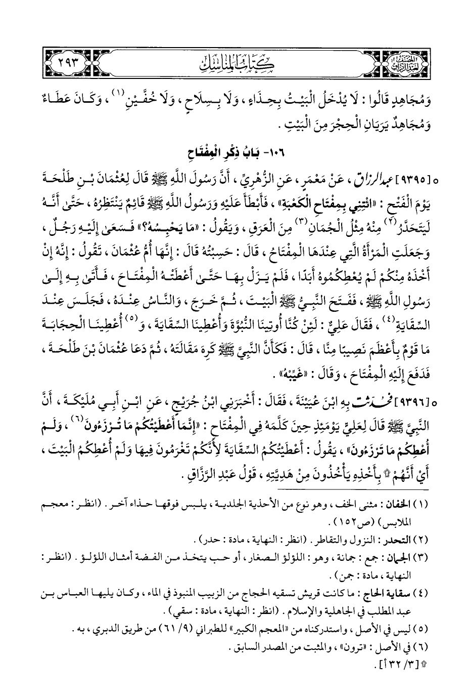 ° [٩٣٩٦] فحُدِّثت بِهِ ابْنَ عُيَيْنَةَ، فَقَالَ: أَخْبَرَنِي ابْنُ جُرَيْجٍ، عَنِ ابْنِ أَبِي مُلَيْكَةَ، أَنَّ النَّبِيَّ - صلى الله عليه وسلم - قالَ لِعَلِيٍّ يَوْمَئِذٍ حِينَ كَلَّمَهُ فِي الْمِفْتَاحِ: "إِنَّمَا أَعْطَيْتُكُمْ مَا تُرْزَءُونَ (¬٦)، وَلَمْ أُعْطِكُمْ مَا تَرْزَءُونَ"، يَقُولُ: أَعْطَيْتُكُمُ السِّقَايَةَ لِأنَّكُمْ تَغْرَمُونَ فِيهَا وَلَمْ أُعْطِكُمُ الْبَيْتَ، أَيْ أَنَّهُمْ * بِأَخْذِهِ يَأْخُذُونَ مِنْ هَدِيَّتِهِ، قَوْلُ عَبْدِ الرَّزَّاقِ.