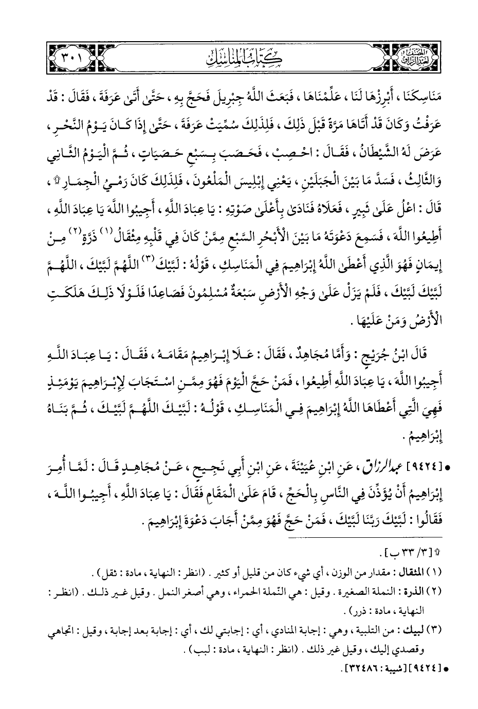 مَنَاسِكَنَا، أَبْرِزْهَا لَنَا، عَلِّمْنَاهَا، فَبَعَثَ اللَّهُ جِبْرِيلَ فَحَجَّ بِهِ، حَتَّى أَتَى عَرَفَةَ، فَقَالَ: قَدْ عَرَفْتُ وَكَانَ قَدْ أَتَاهَا مَرَّةً قَبْلَ ذَلِكَ، فَلِذَلِكَ سُمِّيَتْ عَرَفَةَ، حَتَّى إِذَا كَانَ يَوْمُ النَّحْرِ، عَرَضَ لَهُ الشَّيْطَانُ، فَقَالَ: احْصِبْ، فَحَصَبَ بِسَبْعِ حَصَيَاتٍ، ثُمَّ الْيَوْمُ الثَّانِي وَالثَّالِثُ، فَسَدَّ مَا بَيْنَ الْجَبَلَيْنِ، يَعْنِي إِبْلِيسَ الْمَلْعُونَ، فَلِذَلِكَ كَانَ رَمْيُ الْجِمَارِ *، قَالَ: اعْلُ عَلَى ثَبِيرٍ، فَعَلَاهُ فَنَادَى بِأَعْلَى صَوْتِهِ: يَا عَبَادَ اللَّهِ، أَجِيبُوا اللَّهَ يَا عِبَادَ اللَّهِ، أَطِيعُوا اللَّهَ، فَسَمِعَ دَعْوَتَهُ مَا بَيْنَ الْأَبْحُرِ السَّبْعِ مِمَّنْ كَانَ فِي قَلْبِهِ مِثْقَالُ (¬١) ذَرَّةٍ (¬٢) مِنْ إِيمَانٍ فَهُوَ الَّذِي أَعْطَى اللَّهُ إِبْرَاهِيمَ فِي الْمَنَاسِكِ، قَوْلُهُ: لَبَّيْكَ (¬٣) اللَّهُمَّ لَبَّيْكَ، اللَّهُمَّ لَبَّيْكَ لَبَّيْكَ، فَلَمْ يَزَلْ عَلَى وَجْهِ الْأَرْضِ سَبْعَةٌ مُسْلِمُونَ فَصَاعَدًا فَلَوْلَا ذَلِكَ هَلَكَتِ الْأَرْضُ وَمَنْ عَلَيْهَا.
