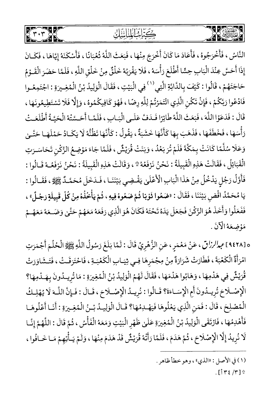 ° [٩٤٢٨] عبد الرزاق، عَنْ مَعْمَرٍ، عَنِ الزُّهْرِيِّ قَالَ: لَمَّا بَلَغَ رَسُولُ اللهِ - صلى الله عليه وسلم - الْحُلُمَ أَجْمَرَتِ امْرَأَةٌ الْكَعْبَةَ، فَطَارَتْ شَرَارَةٌ مِنْ مِجْمَرِهَا فِي ثِيَابِ الْكَعْبَةِ، فَاحْتَرَقَتْ، فَتَشَاوَرَتْ قُرَيْشٌ فِي هَدْمِهَا، وَهَابُوا هَدْمَهَا، فَقَالَ لَهُمُ الْوَلِيدُ بْنُ الْمُغِيرَةِ: مَا تُرِيدُونَ بِهَدْمِهَا؟ الْإِصْلَاحَ تُرِيدُونَ أَمِ الْإِسَاءَةَ؟ قَالُوا: نُرِيدُ الْإِصْلَاحَ، قَالَ: فَإِنَّ اللهَ لَا يُهْلِكُ الْمُصْلِحَ، قَالَ: فَمَنِ الَّذِي يَعْلُوهَا فَيَهْدِمُهَا؟ قَالَ الْوَلِيدُ بْنُ الْمُغِيرَةِ: أَنَا أَعْلُوهَا فَأَهْدِمُهَا، فَارْتَقَى الْوَلِيدُ بْنُ الْمُغِيرَةِ عَلَى ظَهْرِ الْبَيْتِ وَمَعَهُ الْفَأْسُ، ثُمَّ قَالَ: اللَّهُمَّ إِنَّا لَا نُرِيدُ إِلَّا الْإِصْلَاحَ، ثُمَّ هَدَمَ، فَلَمَّا رَأَتْهُ قُرَيْشٌ قَدْ هَدَمَ مِنْهَا، وَلَمْ يَأْتِهِمْ مَا خَافُوا،