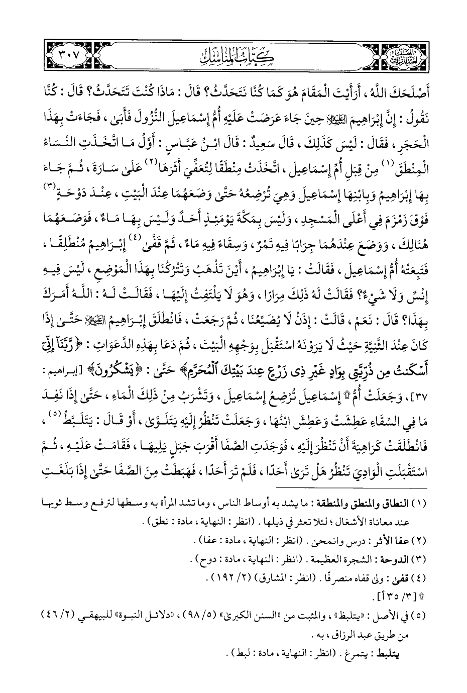 أَصْلَحَكَ اللهُ، أَرَأَيْتَ الْمَقَامَ هُوَ كَمَا كُنَّا نَتَحَدَّثُ؟ قَالَ: مَاذَا كُنْتَ تَتَحَدَّثُ؟ قَالَ: كُنَّا لقُولُ: إِنَّ إِبْرَاهِيمَ - عليه السلام - حِينَ جَاءَ عَرَضَتْ عَلَيْهِ أُمُّ إِسْمَاعِيلَ النُّزُولَ فَأَبَى، فَجَاءَتْ بِهَذَا الْحَجَرِ، فَقَالَ: لَيْسَ كَذَلِكَ، قَالَ سَعِيدٌ: قَالَ ابْنُ عَبَّاسٍ: أَوَّلُ مَا اتَّخَذَتِ النِّسَاءُ الْمِنْطَقَ (¬١) مِنْ قِبَلِ أُمِّ إِسْمَاعِيلَ، اتَّخَذَتْ مِنْطَقًا لِتُعَفِّيَ أَثَرَهَا (¬٢) عَلَى سَارَةَ، ثُمَّ جَاءَ بِهَا إِبْرَاهِيمُ وَبِابْنِهَا إِسْمَاعِيلَ وَهِيَ تُرْضِعُهُ حَتَّى وَضَعَهُمَا عِنْدَ الْبَيْتِ، عِنْدَ دَوْحَةٍ (¬٣) فَوْقَ زَمْزَمَ فِي أَعْلَى الْمَسْجِدِ، وَلَيْسَ بِمَكَّةَ يَوْمَئِذٍ أَحَدٌ وَلَيْسَ بِهَا مَاءٌ، فَوَضَعَهُمَا هُنَالِكَ، وَوَضَعَ عِنْدَهُمَا جِرَابًا فِيهِ تَمْرٌ، وَسِقَاءً فِيهِ مَاءٌ، ثُمَّ قَفَّى (¬٤) إِبْرَاهِيمُ مُنْطَلِقًا، فَتَبِعَتْهُ أُمُّ إِسْمَاعِيلَ، فَقَالَتْ: يَا إِبْرَاهِيمُ، أَيْنَ تَذْهَبُ وَتَتْرُكُنَا بِهَذَا الْمَوْضِعِ، لَيْسَ فِيهِ إِنْسٌ وَلَا شَيْءٌ؟ فَقَالَتْ لَهُ ذَلِكَ مِرَارًا، وَهُوَ لَا يَلْتَفِتُ إِلَيْهَا، فَقَالَتْ لَهُ: اللهُ أَمَرَكَ بِهَذَا؟ قَالَ: نَعَمْ، قَالَتْ: إِذَنْ لَا يُضَيِّعُنَا، ثُمَّ رَجَعَتْ، فَانْطَلَقَ إِبْرَاهِيمُ - عليه السلام - حَتَّى إِذَا كَانَ عِنْدَ الثَّنِيَّةِ حَيْثُ لَا يَرَوْنَهُ اسْتَقْبَلَ بِوَجْهِهِ الْبَيْتَ، ثُمَّ دَعَا بِهَذِهِ الدَّعَوَاتِ: {رَبَّنَا إِنِّي أَسْكَنْتُ مِنْ ذُرِّيَّتِي بِوَادٍ غَيْرِ ذِي زَرْعٍ عِنْدَ بَيْتِكَ الْمُحَرَّمِ} حَتَّى: {يَشْكُرُونَ} [إبراهيم: ٣٧]، وَجَعَلَتْ أُمُّ * إِسْمَاعِيلَ تُرْضِعُ إِسْمَاعِيلَ، وَتَشْرَبُ مِنْ ذَلِكَ الْمَاءِ، حَتَّى إِذَا نَفِدَ مَا فِي السِّقَاءِ عَطِشَتْ وَعَطِشَ ابْنُهَا، وَجَعَلَتْ تَنْظُرُ إِلَيْهِ يَتَلَوَّى، أَوْ قَالَ: يَتَلَبَّطُ (¬٥)، فَانْطَلَقَتْ كَرَاهِيَةَ أَنْ تَنْظُرَ إِلَيْهِ، فَوَجَدَتِ الصَّفَا أَقْرَبَ جَبَلٍ يَلِيهَا، فَقَامَتْ عَلَيْهِ، ثُمَّ اسْتَقْبَلَتِ الْوَادِيَ تَنْظُرُ هَلْ تَرَى أَحَدًا، فَلَمْ تَرَ أَحَدًا، فَهَبَطَتْ مِنَ الصَّفَا حَتَّى إِذَا بَلَغَتِ