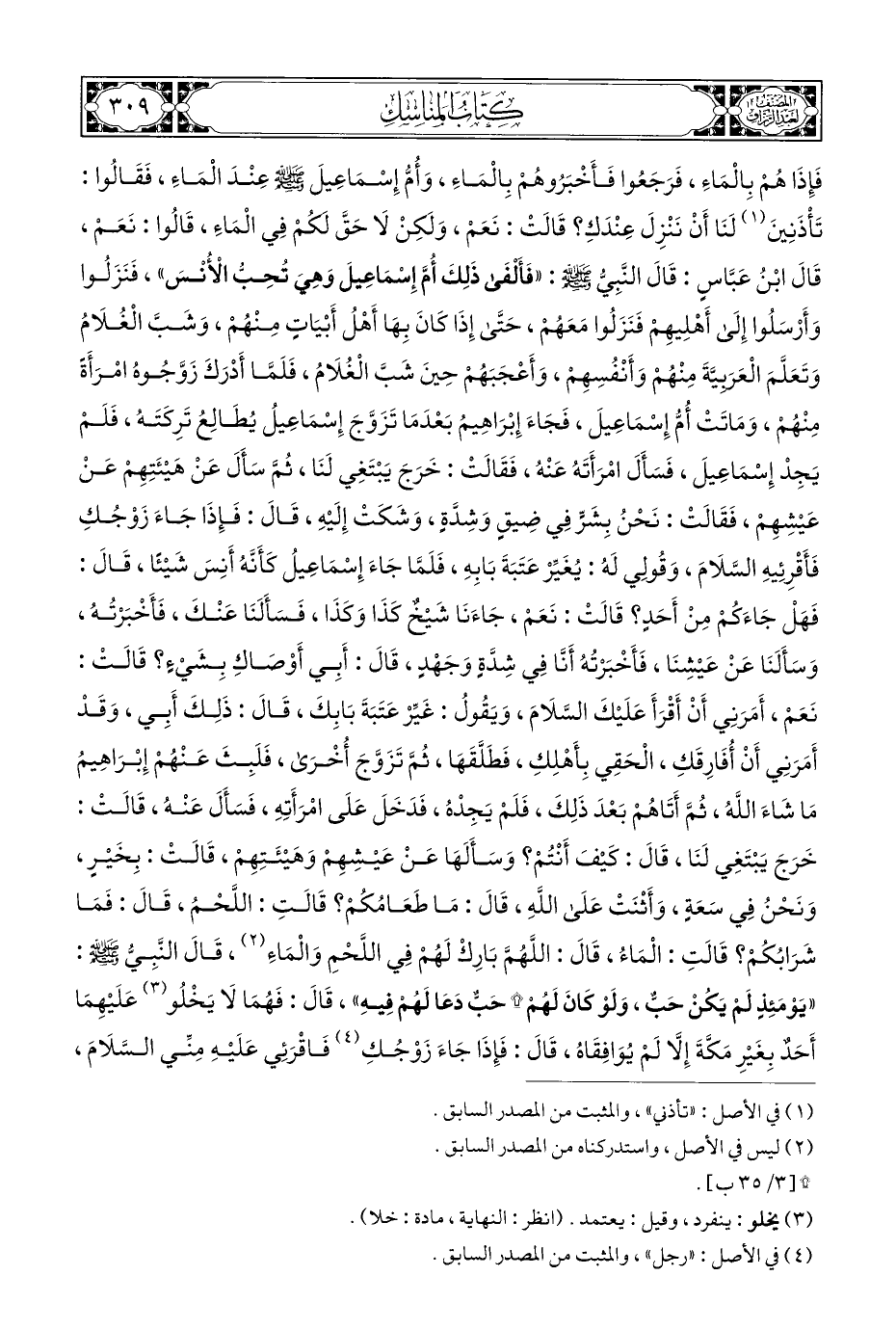 فَإِذَا هُمْ بِالْمَاءِ، فَرَجَعُوا فَأَخْبَرُوهُمْ بِالْمَاءِ، وَأُمُّ إِسْمَاعِيلَ - صلى الله عليه وسلم - عِنْدَ الْمَاءِ، فَقَالُوا: تَأْذَنِينَ (¬١) لَنَا أَنْ نَنْزِلَ عِنْدَكِ؟ قَالَتْ: نَعَمْ، وَلكِنْ لَا حَقَّ لكمْ فِي الْمَاءِ، قَالُوا: نَعَمْ، قَالَ ابْنُ عَبَّاسٍ: قَالَ النَّبِيُّ - صلى الله عليه وسلم -: "فَأَلْفَى ذَلِكَ أُمَّ إِسْمَاعِيلَ وَهِيَ تُحِبُّ الْأُنْسَ"، فَنَزَلُوا وَأَرْسَلُوا إِلَى أَهْلِيهِمْ فَنَزَلُوا مَعَهُمْ، حَتَّى إِذَا كَانَ بِهَا أَهْلُ أَبْيَاتٍ مِنْهُمْ، وَشَبَّ الْغُلَامُ وَتَعَلَّمَ الْعَرَبِيَّةَ مِنْهُمْ وَأَنْفُسِهِمْ، وَأَعْجَبَهُمْ حِينَ شَبَّ الْغُلَامُ، فَلَمَّا أَدْرَكَ زَوَّجُوهُ امْرَأَةً مِنْهُمْ، وَمَاتَتْ أُمُّ إِسْمَاعِيلَ، فَجَاءَ إِبْرَاهِيمُ بَعْدَمَا تَزَوَّجَ إِسْمَاعِيلُ يُطَالِعُ تَرِكَتَهُ، فَلَمْ يَجِدْ إِسْمَاعِيلَ، فَسَأَلَ امْرَأَتَهُ عَنْهُ، فَقَالَتْ: خَرَجَ يَبْتَغِي لَنَا، ثُمَّ سَأَلَ عَنْ هَيْئَتِهِمْ عَنْ عَيْشِهِمْ، فَقَالَتْ: نَحْنُ بِشَرٍّ فِي ضِيقٍ وَشِدَّةٍ، وَشَكَتْ إِلَيْهِ، قَالَ: فَإِذَا جَاءَ زَوْجُكِ فَأَقْرِئِيهِ السَّلَامَ، وَقُولِي لَهُ: يُغَيِّرْ عَتَبَةَ بَابِهِ، فَلَمَّا جَاءَ إِسْمَاعِيلُ كَأَنَّهُ أَنِسَ شَيْئًا، قَالَ: فَهَلْ جَاءَكُمْ مِنْ أَحَدٍ؟ قَالَتْ: نَعَمْ، جَاءَنَا شَيْخٌ كَذَا وَكَذَا، فَسَأَلَنَا عَنْكَ، فَأَخْبَرْتُهُ، وَسَأَلَنَا عَنْ عَيشِنَا، فَأَخْبَرْتُهُ أَنَّا فِي شِدَّةٍ وَجَهْدٍ، قَالَ: أَبِي أَوْصَاكِ بِشَيءٍ؟ قَالَتْ: نَعَمْ، أَمَرَنِي أَنْ أَقْرَأَ عَلَيْكَ السَّلَامَ، وَيَقُولُ: غَيِّرْ عَتَبَةَ بَابِكَ، قَالَ: ذَلِكَ أَبِي، وَقَدْ أَمَرَنِي أَنْ أُفَارِقَكِ، الْحَقِي بِأَهْلِكِ، فَطَلَّقَهَا، ثُمَّ تَزَوَّجَ أُخْرَى، فَلَبِثَ عَنْهُمْ إِبْرَاهِيمُ مَا شَاءَ اللهُ، ثُمَّ أَتَاهُمْ بَعْدَ ذَلِكَ، فَلَمْ يَجِدْهُ، فَدَخَلَ عَلَى امْرَأَتِهِ، فَسَأَلَ عَنْهُ، قَالَتْ: خَرَجَ يَبْتَغِي لَنَا، قَالَ: كَيْفَ أَنْتُمْ؟ وَسَأَلَهَا عَنْ عَيْشِهِمْ وَهَيْئَتِهِمْ، قَالَتْ: بِخَيْرٍ، وَنَحْنُ فِي سَعَةٍ، وَأَثْنَتْ عَلَى اللهِ، قَالَ: مَا طَعَامُكُمْ؟ قَالَتِ: اللَّحْمُ، قَالَ: فَمَا شَرَابُكُمْ؟ قَالَتِ: الْمَاءُ، قَالَ: اللَّهُمَّ بَارِكْ لَهُمْ فِي اللَّحْمِ وَالْمَاءِ (¬٢)، قَالَ النَّبِيُّ - صلى الله عليه وسلم -: "يَوْمَئِذٍ لَمْ يَكُنْ حَبٌّ، وَلَوْ كَانَ لَهُمْ * حَبٌّ دَعَا لَهُمْ فِيهِ"، قَالَ: فَهُمَا لَا يَخْلُو (¬٣) عَلَيْهِمَا أَحَدٌ بِغَيْرِ مَكَّةَ إِلَّا لَمْ يُوَافِقَاهُ، قَالَ: فَإِذَا جَاءَ زَوْجُكِ (¬٤) فَاقْرَئِي عَلَيْهِ مِنِّي السَّلَامَ،