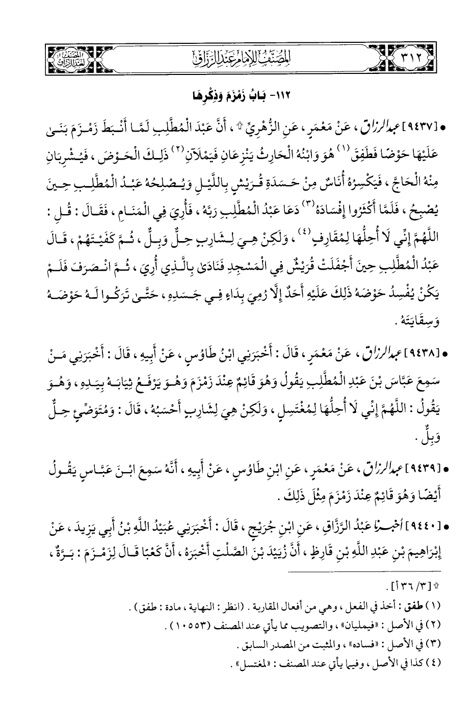 • [٩٤٣٧] عبد الرزاق، عَنْ مَعْمَرٍ، عَنِ الزُّهْرِيِّ *، أَنَّ عَبْدَ الْمُطَّلِبِ لَمَّا أَنْبَطَ زَمْزَمَ بَنَى عَلَيْهَا حَوْضًا فَطَفِقَ (¬١) هُوَ وَابْنُهُ الْحَارِثُ يَنْزِعَانِ فَيَمْلَآنِ (¬٢) ذَلِكَ الْحَوْضَ، فَيُشْرِبَانِ مِنْهُ الْحَاجَّ، فَيَكْسِرُهُ أُنَاسٌ مِنْ حَسَدَةِ قُرَيْشٍ بِاللَّيْلِ وَيُصْلِحُهُ عَبْدُ الْمُطلِبِ حِينَ يُصْبحُ، فَلَمَّا أَكْثَرُوا إِفْسَادَهُ (¬٣) دَعَا عَبْدُ الْمُطَّلِبِ رَبَّهُ، فَأُرِيَ فِي الْمَنَامِ، فَقَالَ: قُلِ: اللَّهُمَّ إِنِّي لَا أُحِلُّهَا لِمُقَارِفٍ (¬٤)، وَلكِنْ هِيَ لِشَارِبٍ حِلٌّ وَبِلٌّ، ثُمَّ كَفَيْتَهُمْ، قَالَ عَبْدُ الْمُطَّلِبِ حِينَ أَجْفَلَتْ قُرَيْشٌ فِي الْمَسْجِدِ فَنَادَى بِالَّذِي أُرِيَ، ثُمَّ انْصَرَفَ فَلَمْ يَكُنْ يُفْسِدُ حَوْضهُ ذَلِكَ عَلَيْهِ أَحَدٌ إِلَّا رُمِيَ بِدَاءٍ فِي جَسَدِهِ، حَتَّى تَرَكُوا لَهُ حَوْضهُ وَسِقَايَتَهُ.