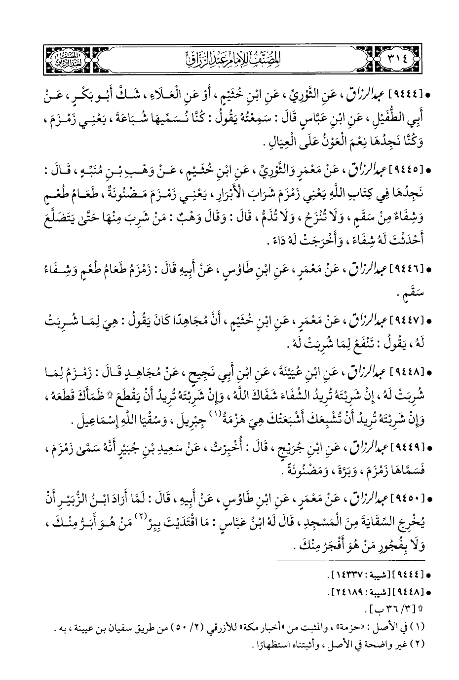 • [٩٤٤٩] عبد الرزاق، عَنِ ابْنِ جُرَيْجٍ، قَالَ: أُخْبِرْتُ، عَنْ سَعِيدِ بْنِ جُبَيْرٍ أَنَّهُ سَمَّى زَمْزَمَ، فَسَمَّاهَا زَمْزَمَ، وَبَرَّةَ، وَمَضْنُونَةً.