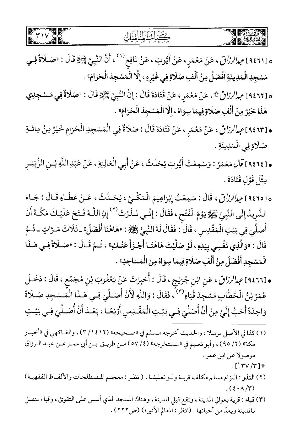 ° [٩٤٦٢] عبد الرزاق *، عَنْ مَعْمَرٍ، عَنْ قَتَادَةَ قَالَ: إِنَّ النَّبِيَّ - صلى الله عليه وسلم - قَالَ: "صَلَاةٌ فِي مَسْجِدِي هَذَا خَيْرٌ مِنْ ألمفِ صَلَاةِ فِيمَا سِوَاهُ، إِلَّا الْمَسْجِدَ الْحَرَامَ".