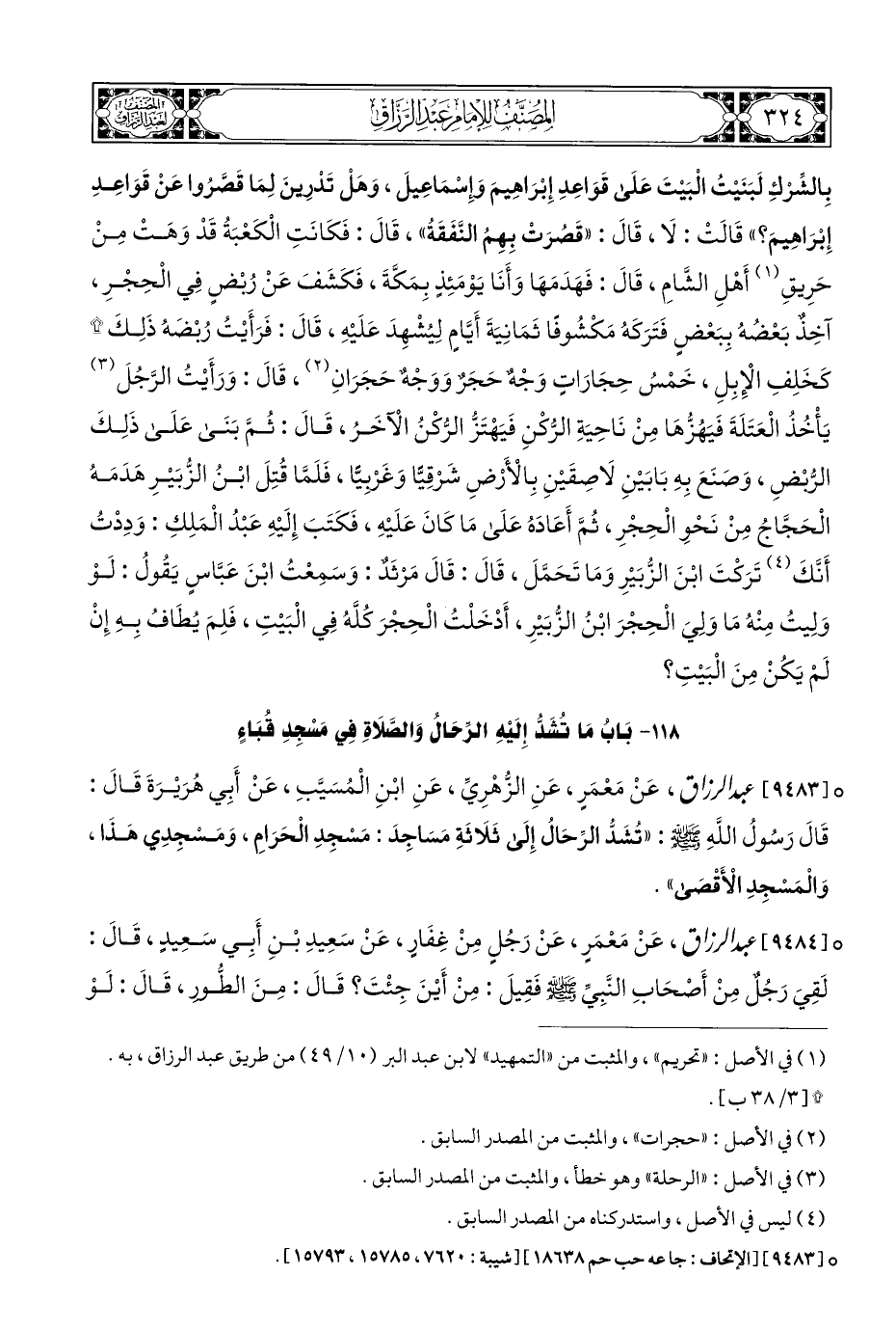 ° [٩٤٨٣] عبد الرزاق، عَنْ مَعْمَرٍ، عَنِ الزُّهْرِيِّ، عَنِ ابْنِ الْمُسَيَّبِ، عَنْ أَبِي هُرَيْرَةَ قَالَ: قَالَ رَسُولُ اللهِ - صلى الله عليه وسلم -: "تُشَدُّ الرِّحَالُ إِلَى ثَلَاثَةِ مَسَاجِدَ: مَسْجِدِ الْحَرَامِ، وَمَسْجِدِي هَذَا، وَالْمَسْجِدِ الْأَقْصَى".