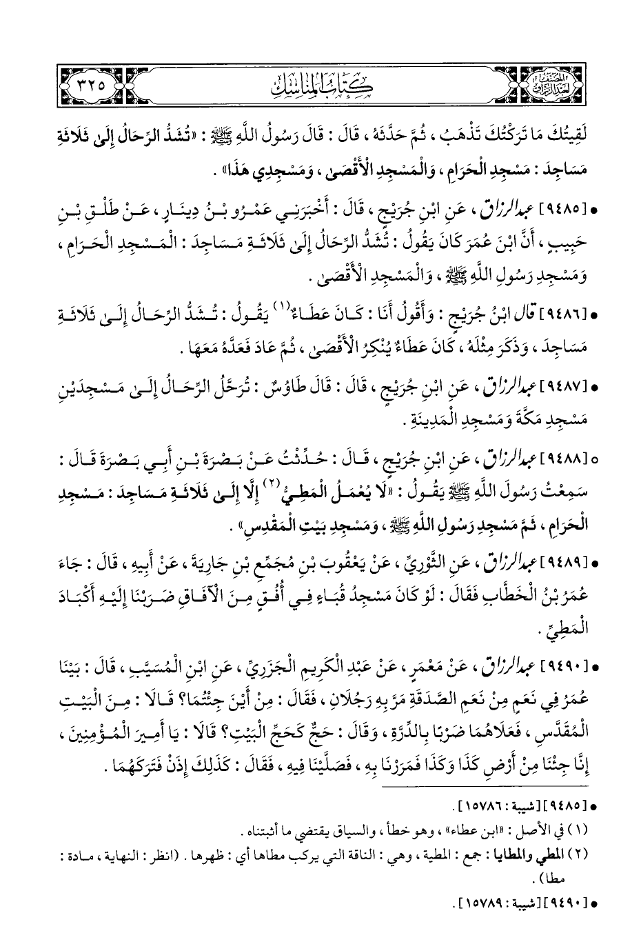 • [٩٤٨٧] عبد الرزاق، عَنِ ابْنِ جُرَيْجٍ، قَالَ: قَالَ طَاوُسٌ: تُرَحَّلُ الرِّحَالُ إِلَى مَسْجِدَيْنِ مَسْجِدِ مَكَّةَ وَمَسْجِدِ الْمَدِينَةِ.
