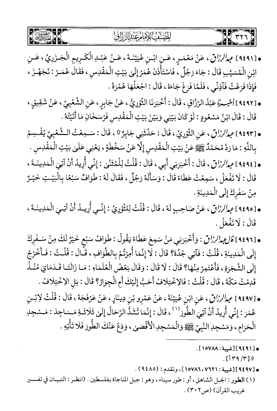 • [٩٤٩٧] عبد الرزاق، عَنِ ابْنِ عُيَيْنَةَ، عَنْ عَمْرِو بْنِ دِينَارٍ، عَنْ عَرْفَجَةَ، قَالَ: قُلْتُ لاِبْنِ عُمَرَ: إِنِّي أُرِيدُ أَنْ آتِيَ الطُّورَ (¬١)، قَالَ: إِنَّمَا تُشَدُّ الرِّحَالُ إِلَى ثَلَاثَةِ مَسَاجِدَ: مَسْجِدِ الْحَرَامِ، وَمَسْجِدِ النَّبِيِّ - صلى الله عليه وسلم - وَالْمَسْجِدِ الْأَقْصَى، وَدع عَنْكَ الطُّورَ فَلَا تَأْتِهِ.