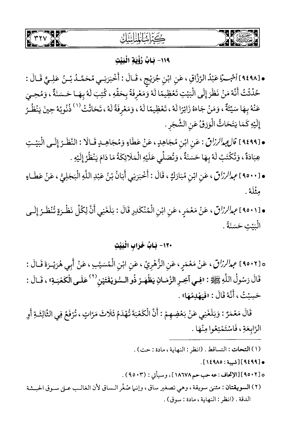 ° [٩٥٠٢] عبد الرزاق، عَنْ مَعْمَرٍ، عَنِ الزُّهْرِيِّ، عَنِ ابْنِ الْمُسَيَّبِ، عَنْ أَبِي هُرَيْرَةَ قَالَ: قَالَ رَسُولُ اللهِ - صلى الله عليه وسلم -: "فِي آخِرِ الزَّمَانِ يَظْهَرُ ذُو السُّوَيْقَتَيْنِ (¬٢) عَلَى الْكَعْبَةِ"، قَالَ: حَسِبْتُ، أَنَّهُ قَالَ: "فَيَهْدِمُهَا".