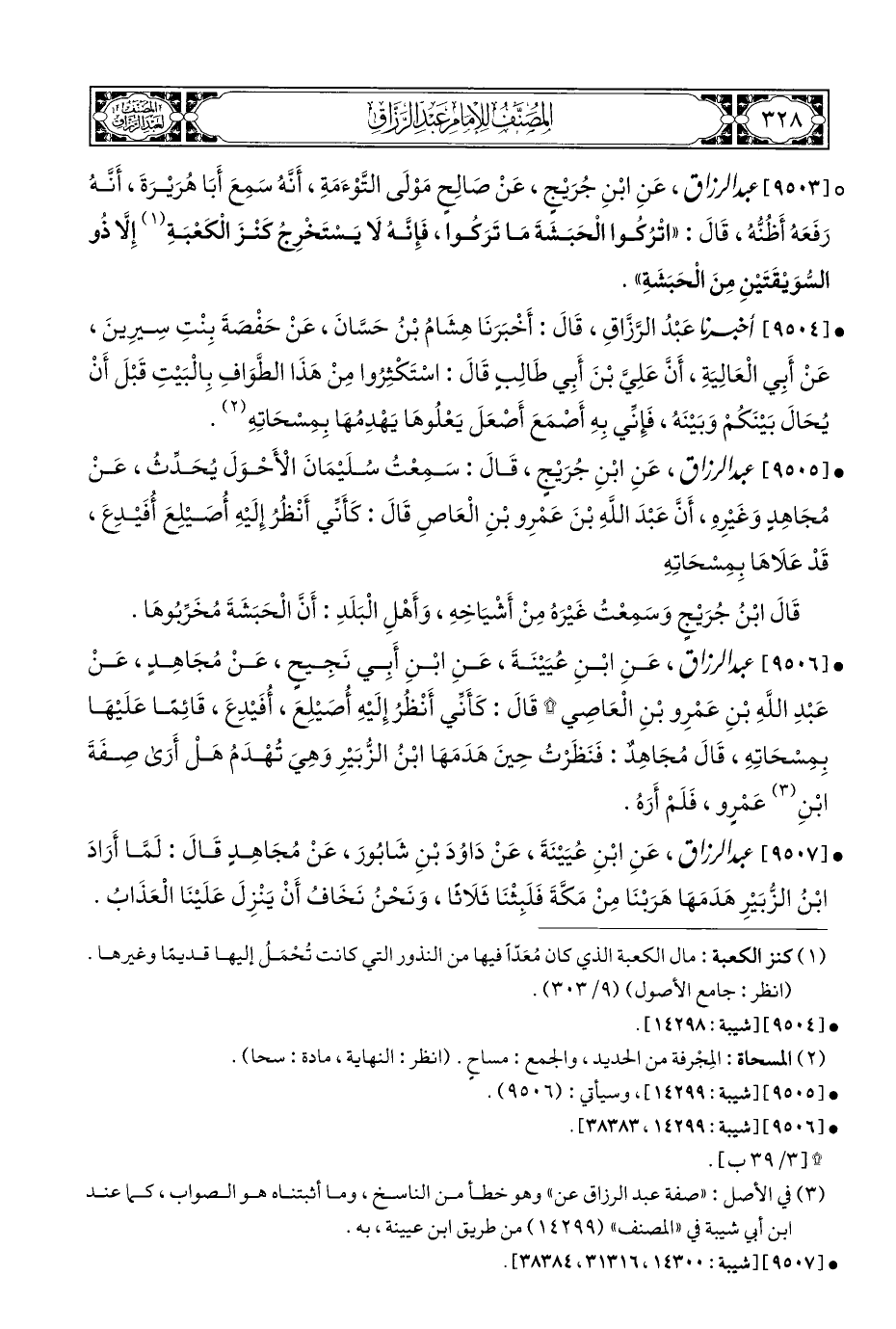 (¬٣) في الأصل: "صفة عبد الرزاق عن" وهو خطأ من الناسخ، وما أثبتناه هو الصواب، كما عند ابن أبي شيبة في "المصنف" (١٤٢٩٩) من طريق ابن عيينة، به.