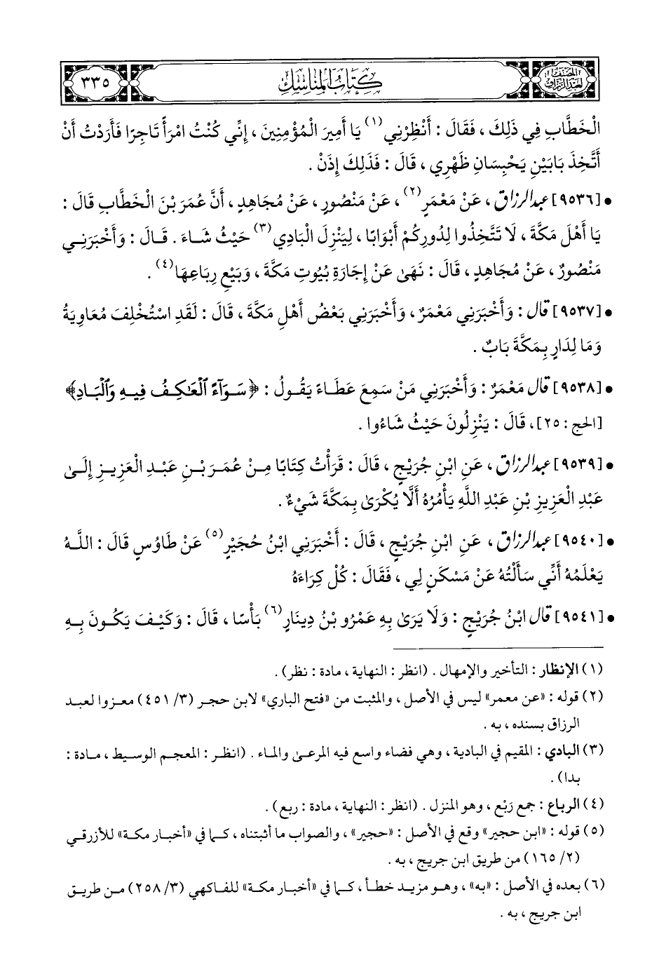 • [٩٥٣٦] عبد الرزاق، عَنْ مَعْمَرٍ (¬٢)، عَنْ مَنْصورٍ، عَنْ مُجَاهِدٍ، أَنَّ عُمَرَ بْنَ الْخَطَّابِ قَالَ: يَا أَهْلَ مَكَّةَ، لَا تَتَّخِذُوا لِدُورِكُمْ أَبْوَابًا، لِيَنْزِلَ الْبَادِي (¬٣) حَيْثُ شَاءَ. قَالَ: وَأَخْبَرَنِي مَنْصُورٌ، عَنْ مُجَاهِدٍ، قَالَ: نَهَى عَنْ إِجَارَةِ بُيُوتِ مَكًةَ، وَبَيْعِ رِبَاعَهَا (¬٤).